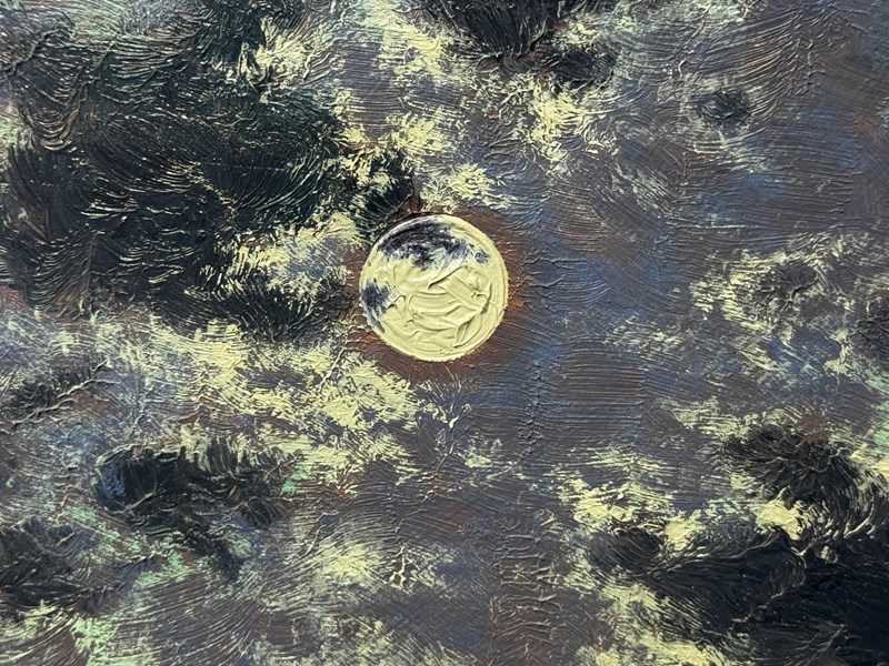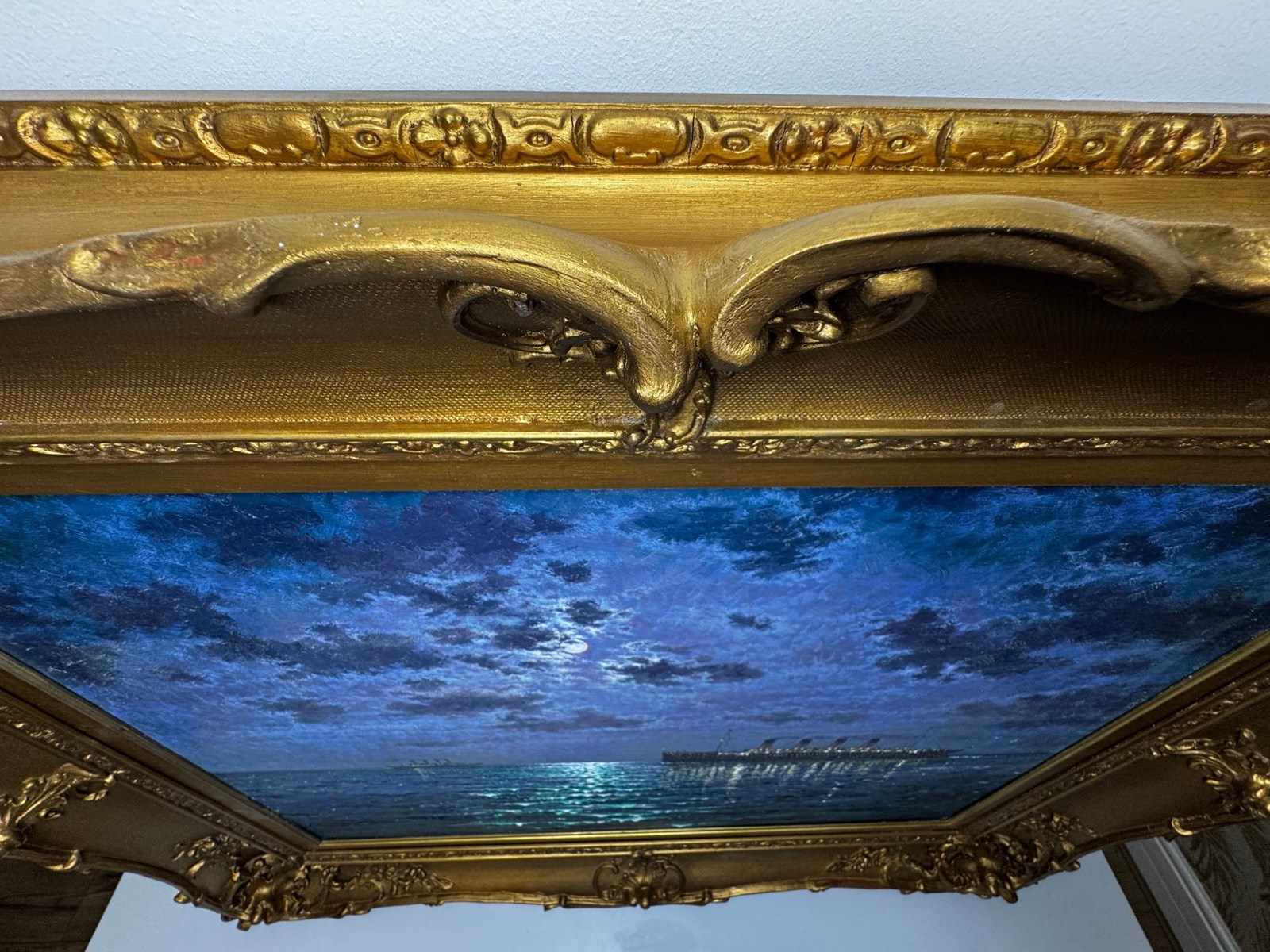 Presented in a substantial, heavy gilt wood frame with applied rococo-style ornamentation. The weight and depth of the carved timber profile give the piece true “gallery wall” authority, while the gilt finish amplifies the nocturne palette and enriches the moonlit highlights in the room.