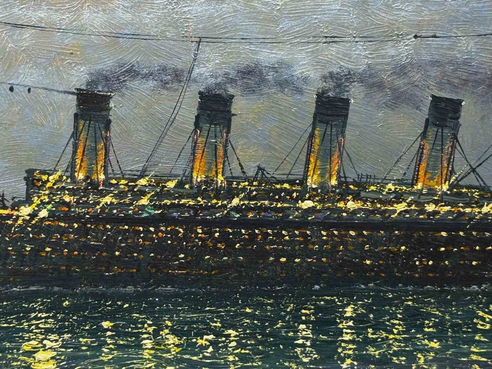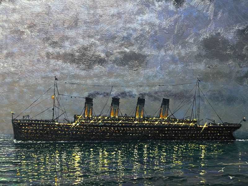 The depiction of RMS Titanic, arguably the most iconic ocean liner of the modern era, elevates the work beyond a conventional maritime scene and positions it as a significant collector’s piece within both the fine art field and the specialist Titanic / White Star Line collecting world.