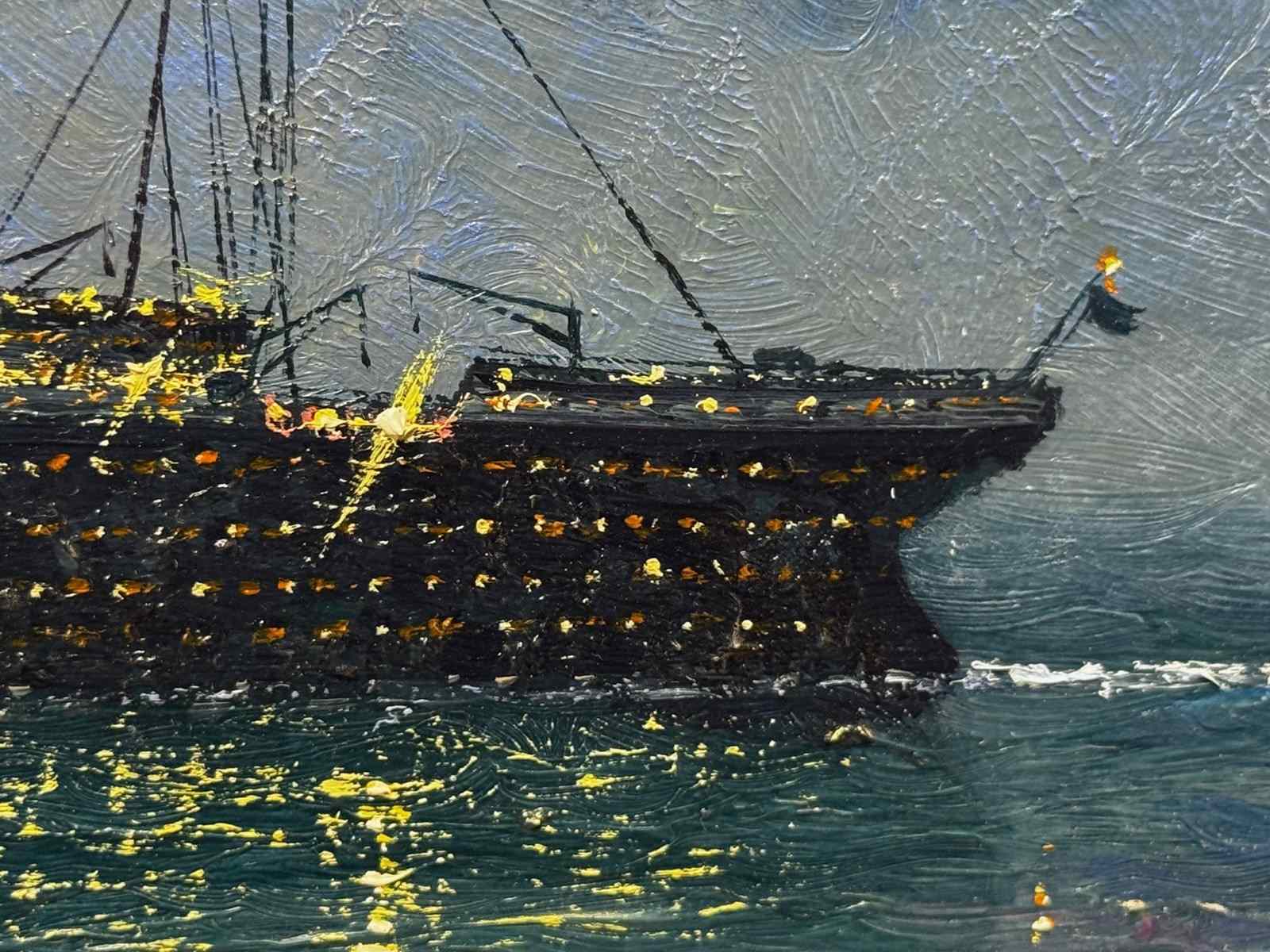 Style / School: Contemporary traditional / academic realism within marine painting, treated as a nocturne—romantic, nostalgic historicism emphasising atmosphere, tonal contrast, and reflective light on water.