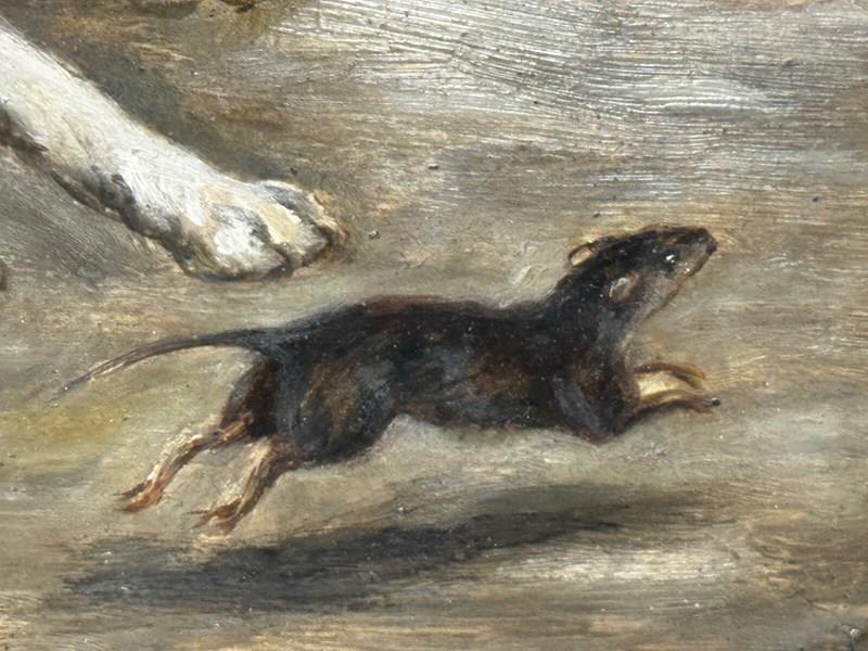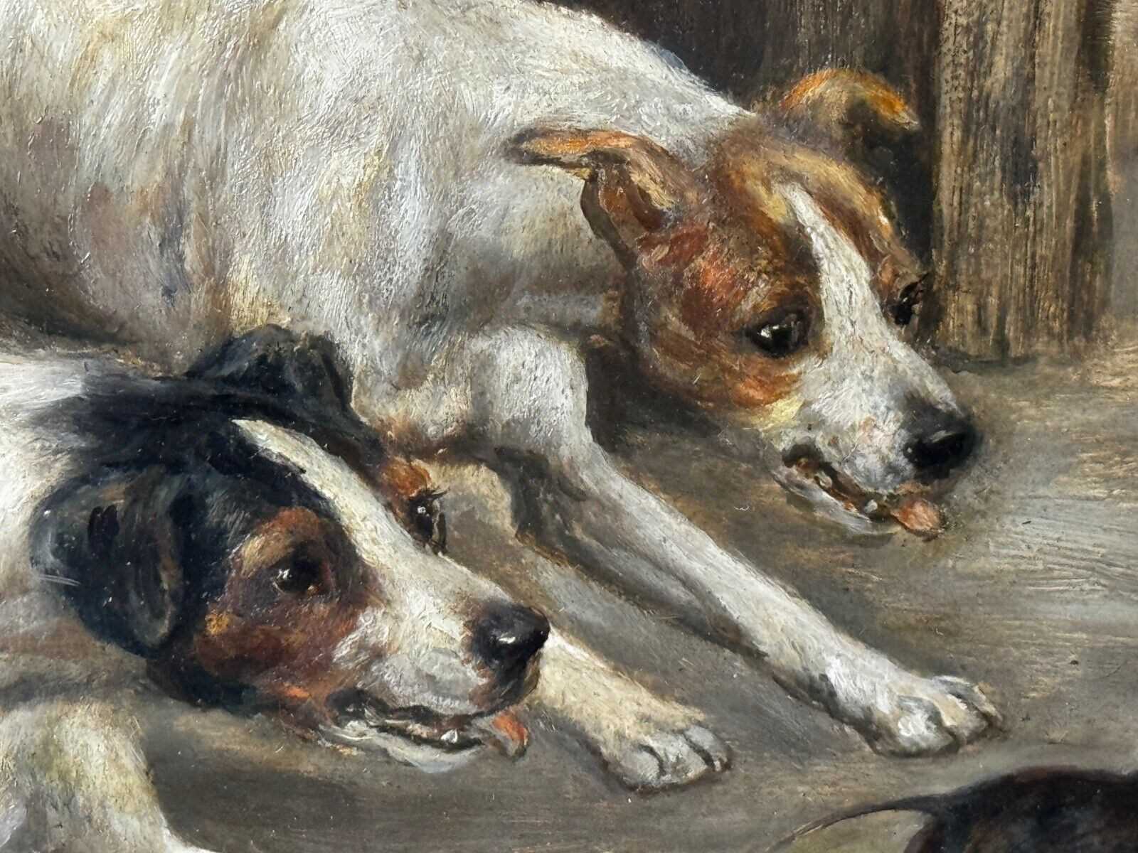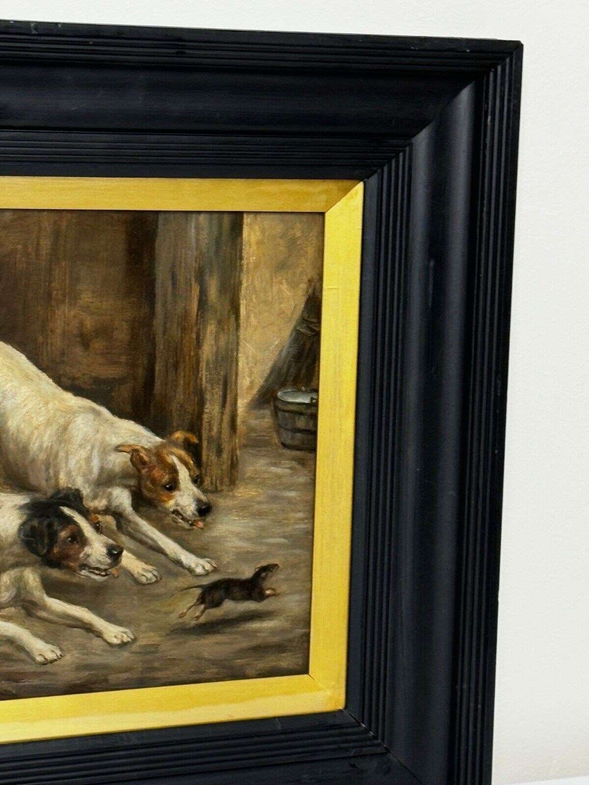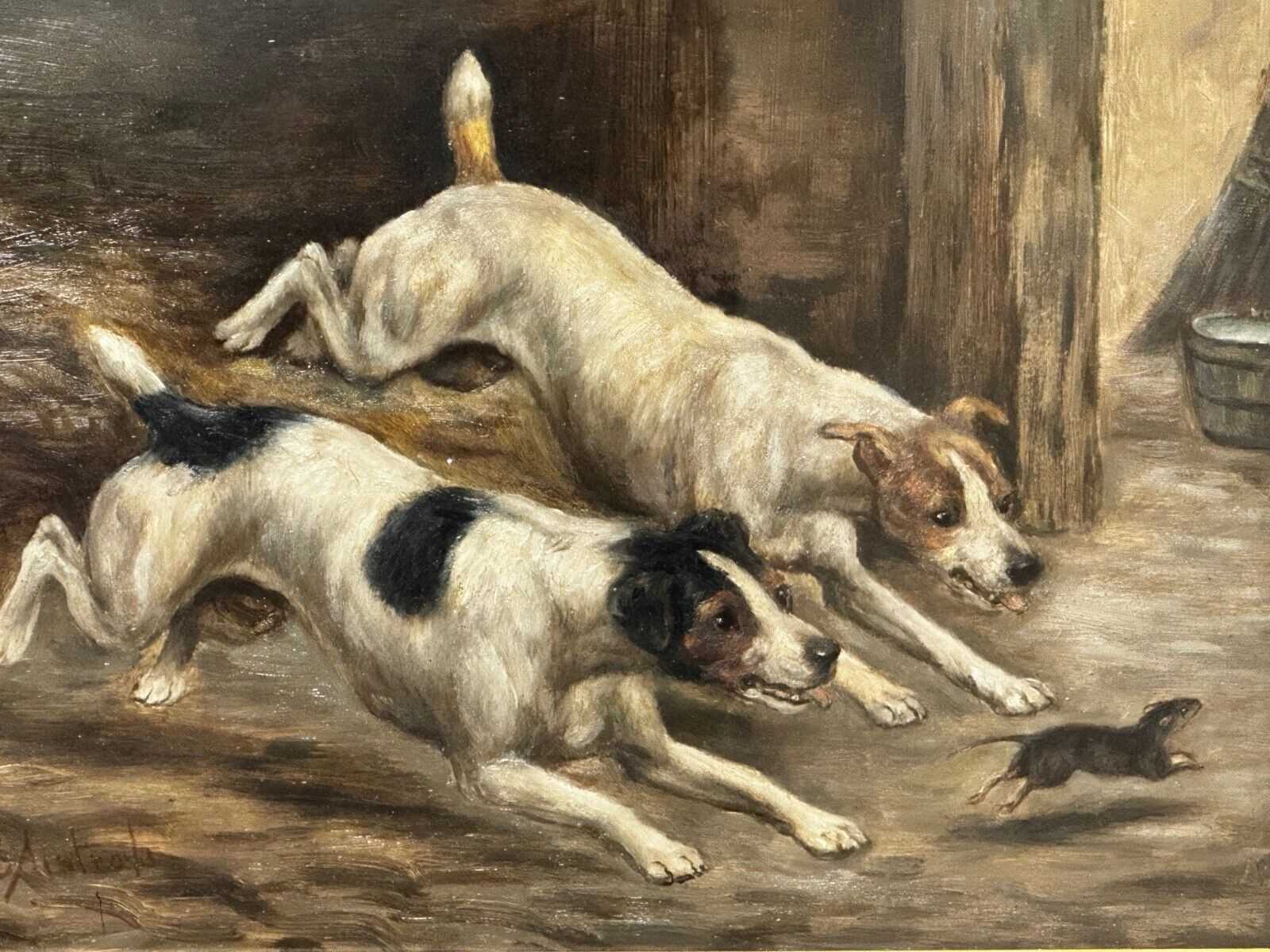 Title: Jack Russell Terrier Dogs in Barn Chasing a Rat (Ratting) by Edward Aistrop, c.1880