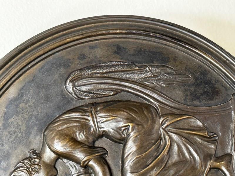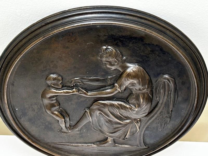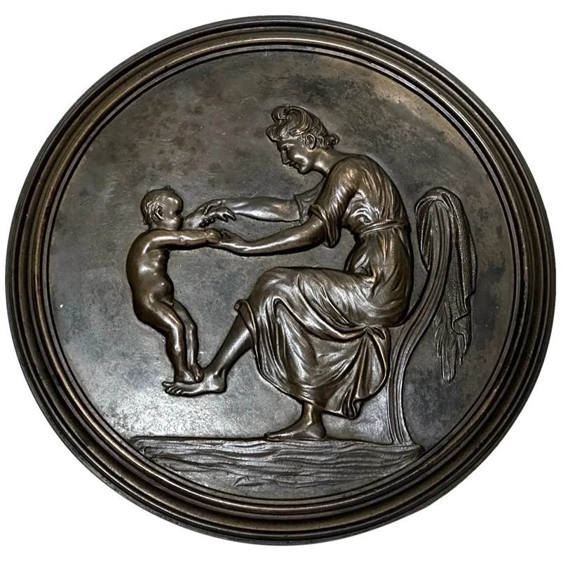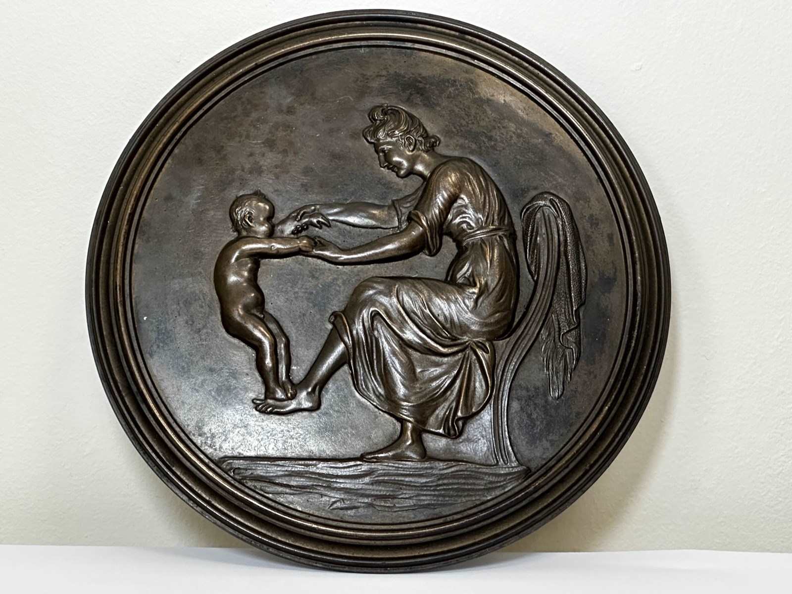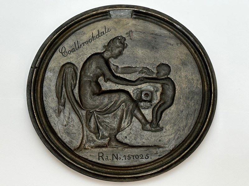 Introducing the fabulous 19th Century Coalbrookdale bronze round wall sculpture of a mother holding her child - an exquisitely crafted piece, add a touch of elegance to your home!