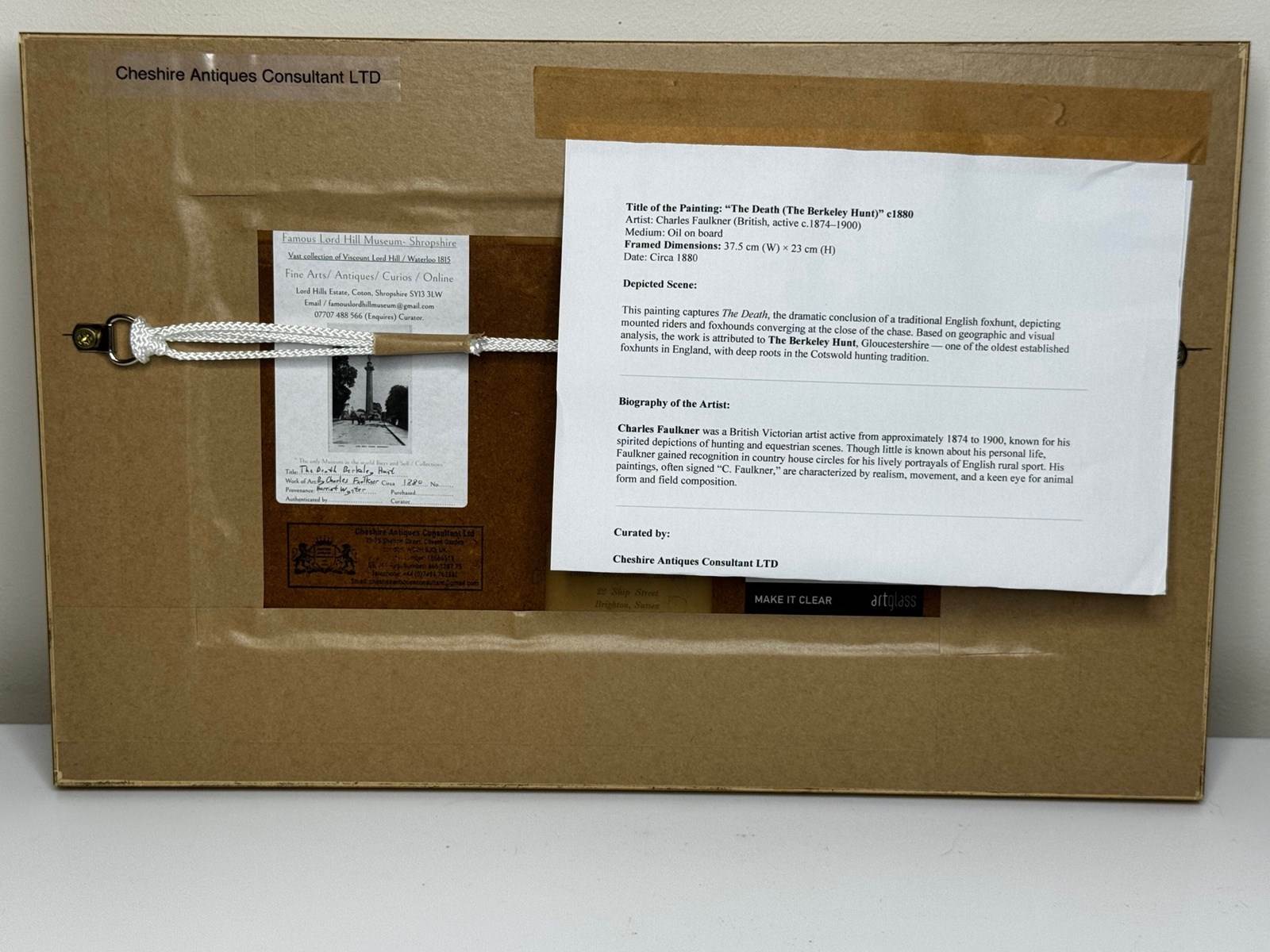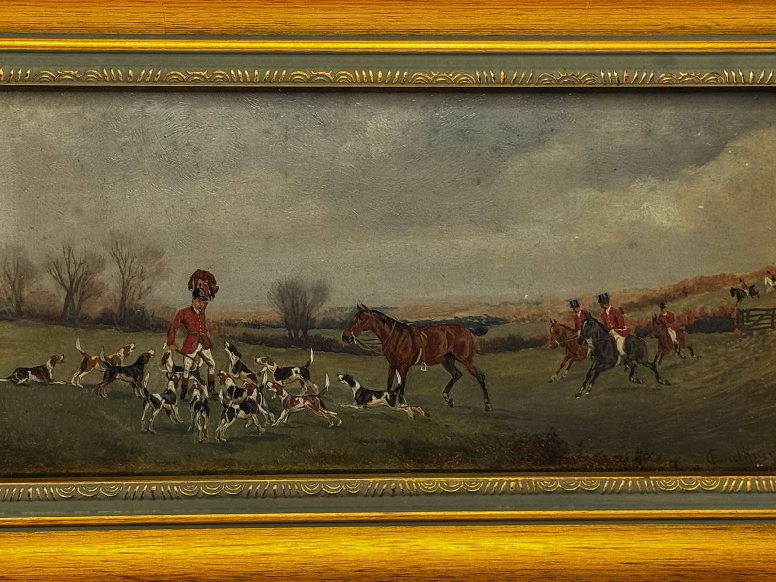 A finely rendered oil on board depicting the pivotal “View Halloo” moment in a traditional English foxhunt. Faulkner enlivens riders, hounds, and the Gloucestershire countryside with atmospheric precision, producing an exemplary late-Victorian sporting narrative. The board support allows for tight draughtsmanship and subtle tonal transitions, essential to the animation of this high-energy scene.