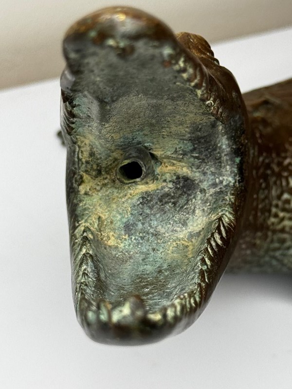 Decades of outdoor life have produced a complex, attractive patina. Warm bronze tones remain on the raised areas, while greenish verdigris has settled into the recesses and around the details. The surface bears honest evidence of age and use – gentle rubbing to the snout, feet and tail tip, and small knocks from garden life – giving it depth and nuance that modern reproductions rarely achieve. Technically and stylistically, the combination of naturalistic modelling with robust plumbing is characteristic of inter-war European decorative bronzes, and a date of around 1920 is entirely consistent.