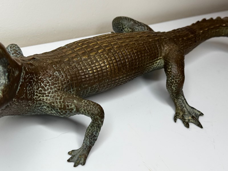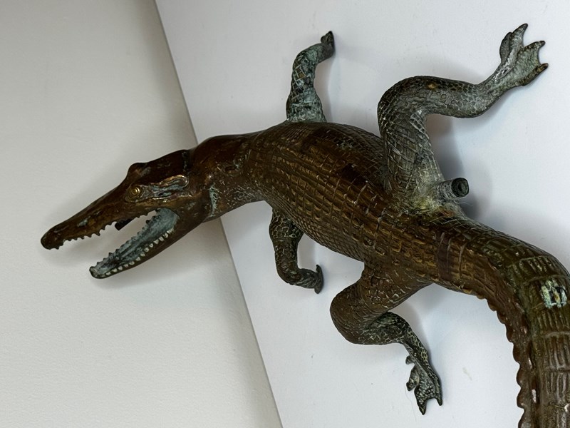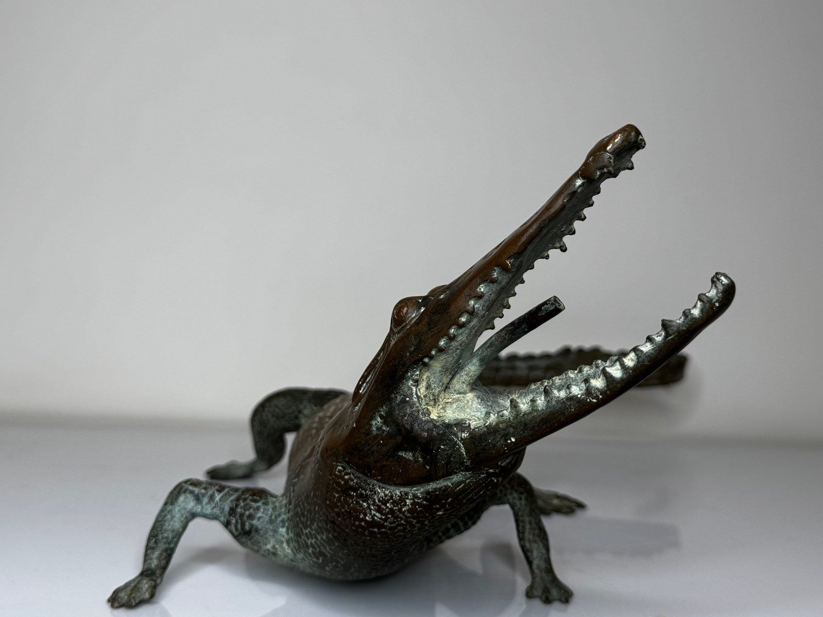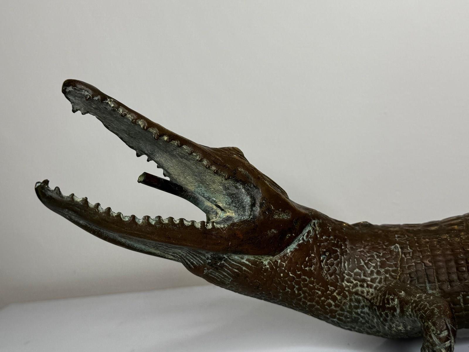 The crocodile is in good decorative condition, with a rich, naturally developed patina showing warmer bronze tones on the high points and greenish verdigris in the recesses. There is honest wear and a few minor knocks from long outdoor use, with light rubbing to exposed areas such as the snout, feet and tail tip and some small losses and weathering-related surface holes commensurate with age. This is precisely the sort of surface experienced buyers look for in a period garden bronze.