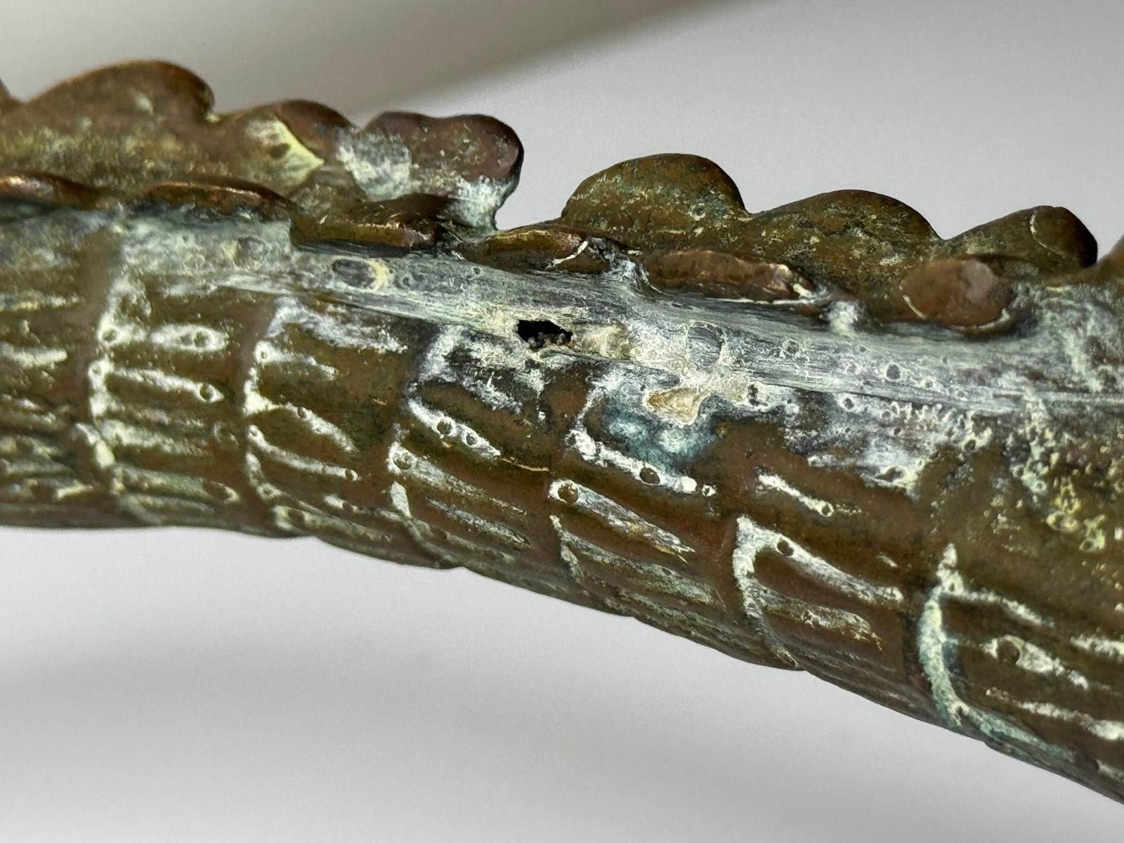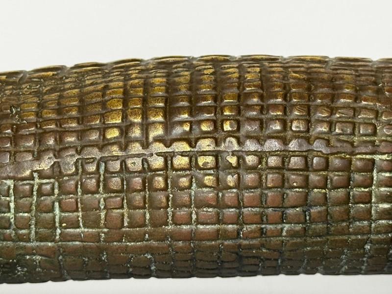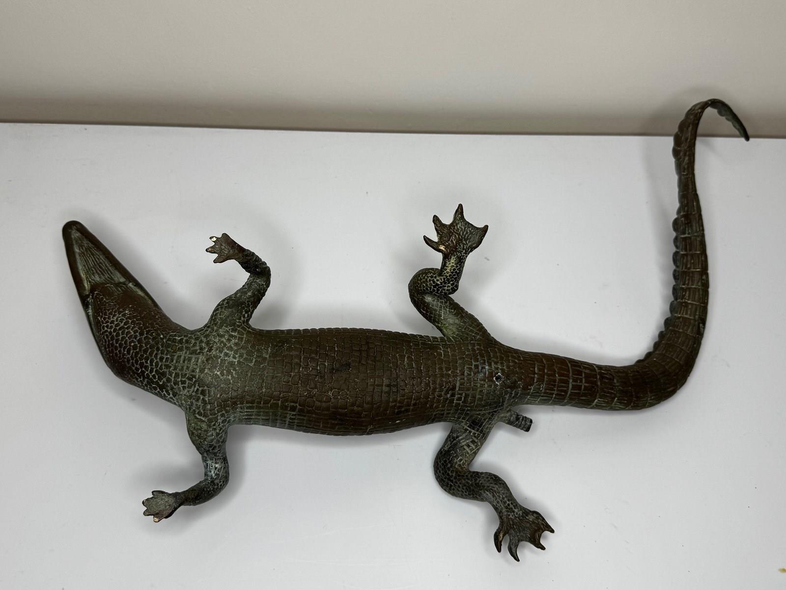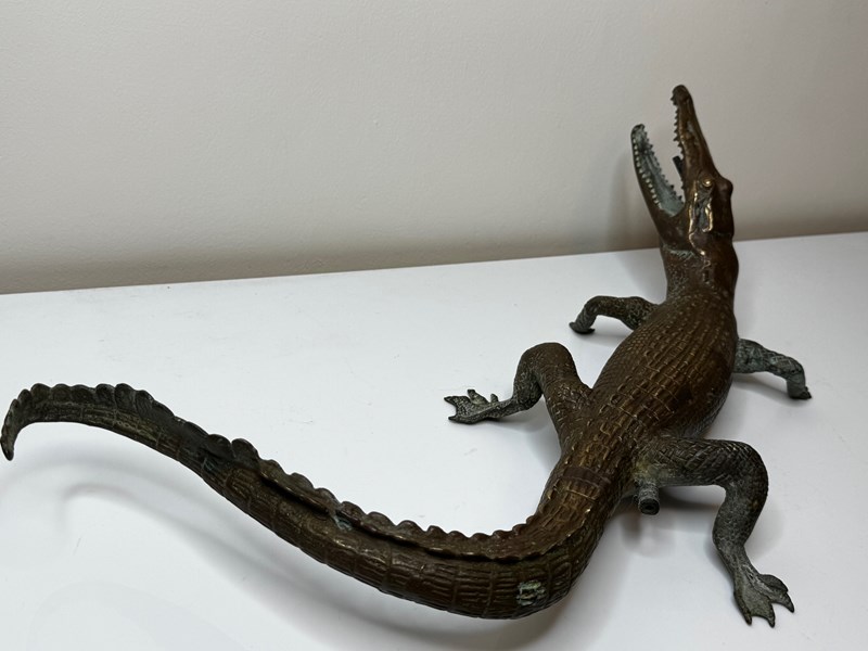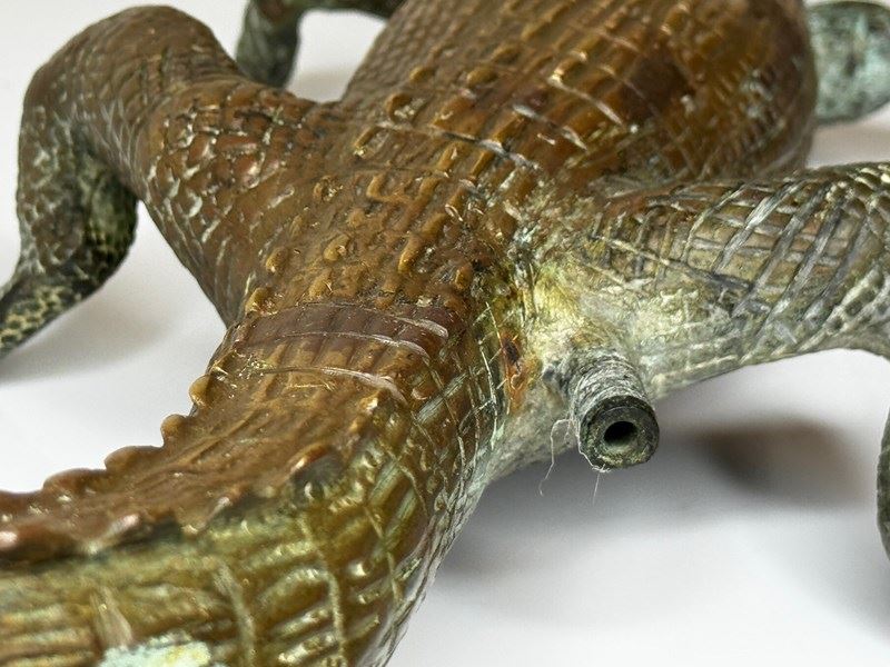 The crocodile is in good decorative condition, with a rich, naturally developed patina showing warmer bronze tones on the high points and greenish verdigris in the recesses. There is honest wear and a few minor knocks from long outdoor use, with light rubbing to exposed areas such as the snout, feet and tail tip and some small losses and weathering-related surface holes commensurate with age. This is precisely the sort of surface experienced buyers look for in a period garden bronze.