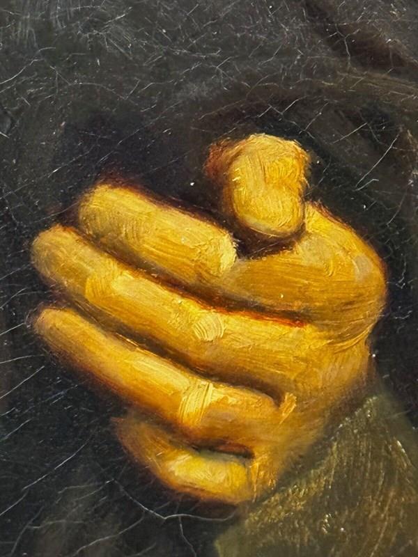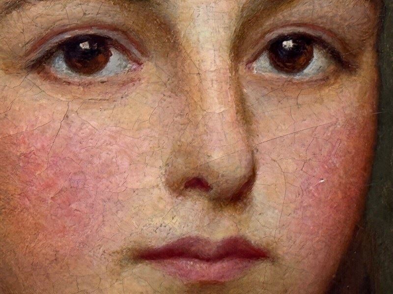 Surface: Fine craquelure with minor professional touch-ups visible under magnification, some minor paint loss in areas to the face.