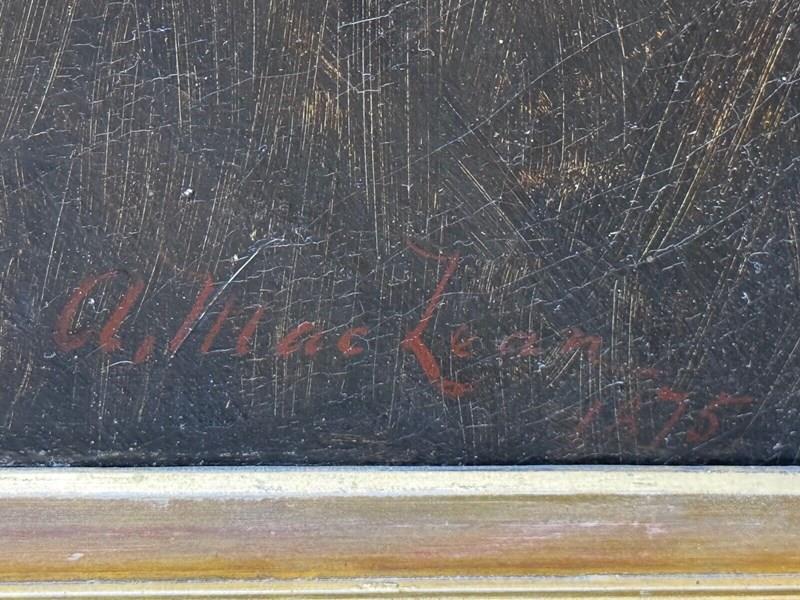 The signature’s placement, pigment tone, and brushwork align closely with those recorded on Maclean’s exhibited pieces at the Royal Academy in the 1870s. It remains crisp and legible beneath the original varnish, supporting its authenticity and period origin.