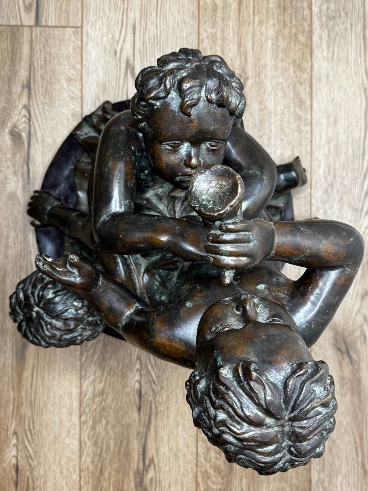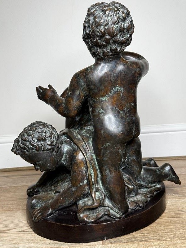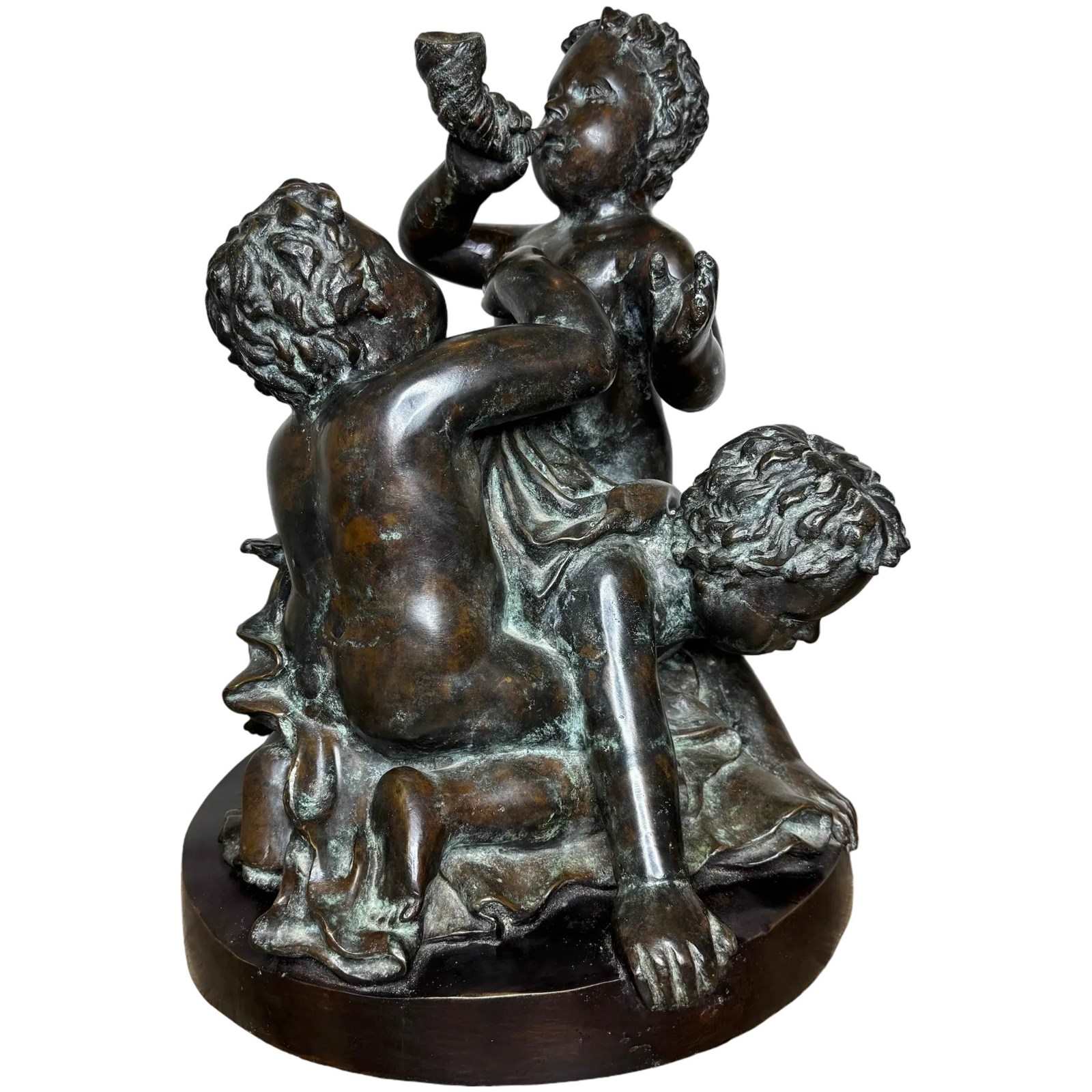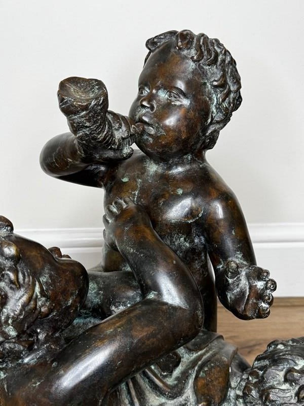 Modelled in the spirit of Clodion (Claude Michel), the group captures the fluid Rococo lines, expressive charm, and dynamic movement for which his school became renowned. The Triton child raises the conch to summon the sea, while the attendant putti twist and embrace in joyful animation. The sculpture retains its original warm patina, with fine ciselure (hand-chasing) visible in the hair, anatomy, and drapery.