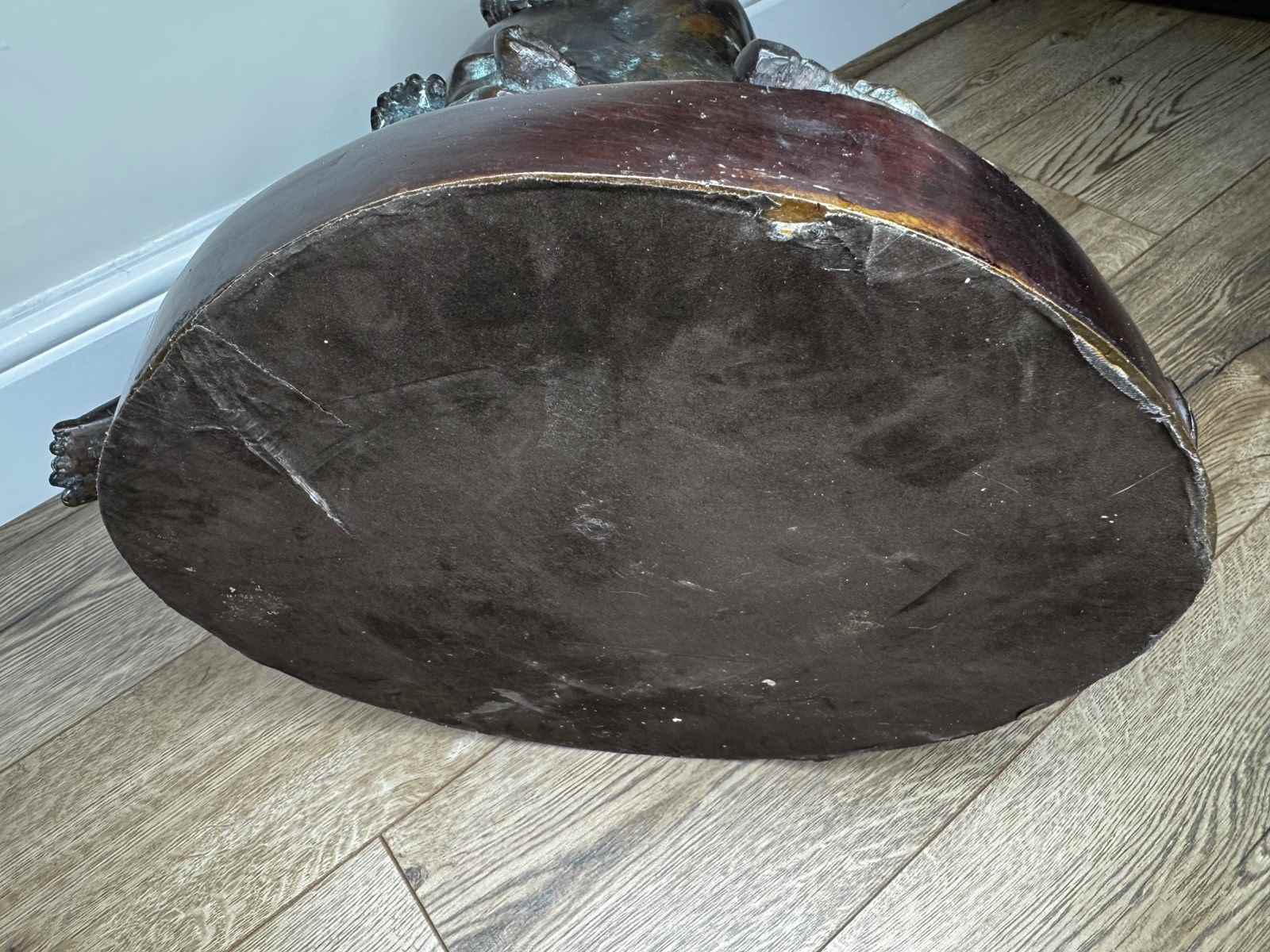 Good original condition with rich, untouched antique patina and areas of verdigris consistent with age. Unsigned and without foundry mark, as typical for the period. Any original stamp may have worn away or may never have been applied. No structural issues are present, and the surface retains its authentic period finish. Minor wear and small losses to the fabric lining underneath.