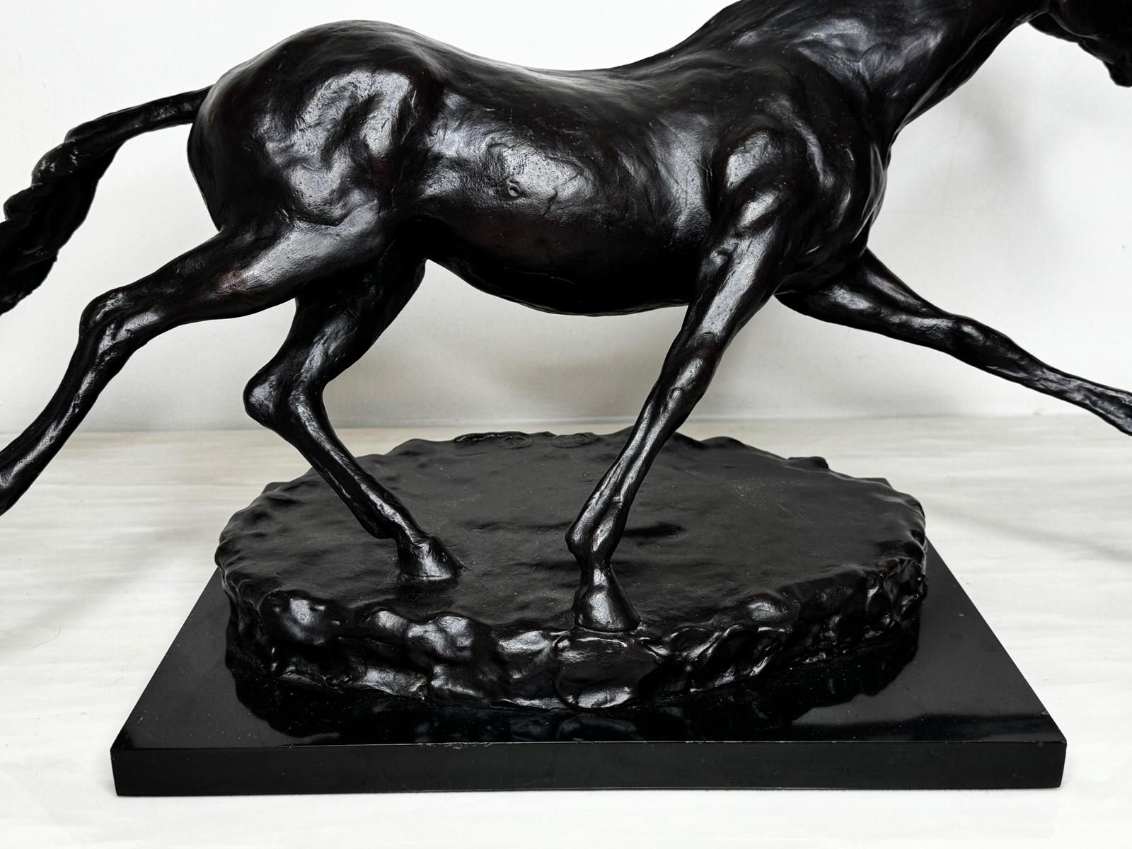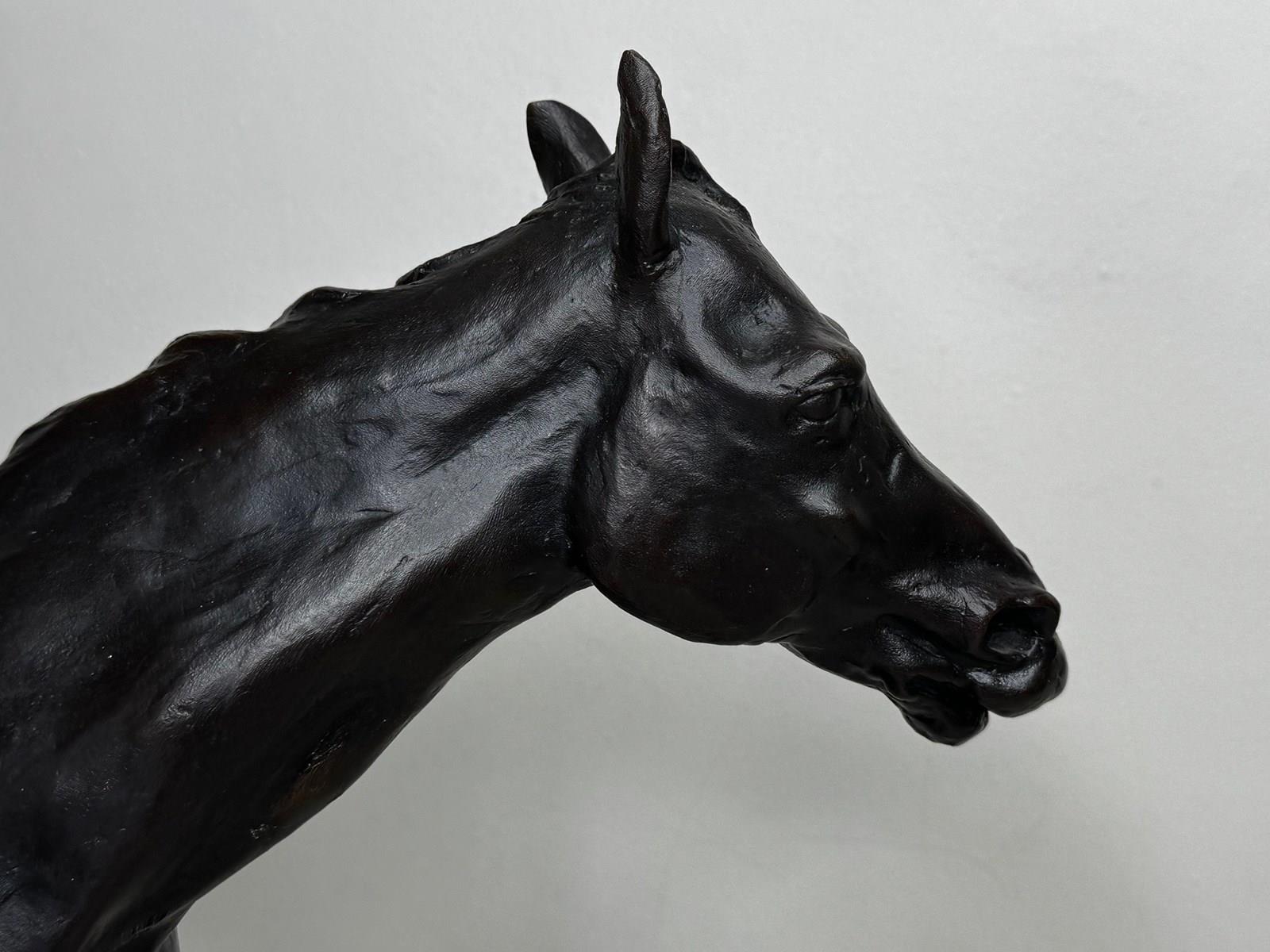 The composition conveys forward momentum and controlled power, with the horse’s elongated form and driving posture creating a strong sense of movement. Plazzotta’s ability to translate motion into solid bronze makes this an exceptional example of 20th-century equestrian sculpture.