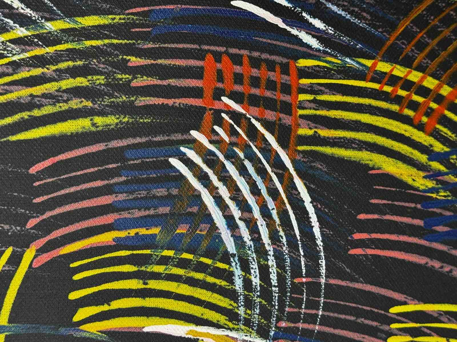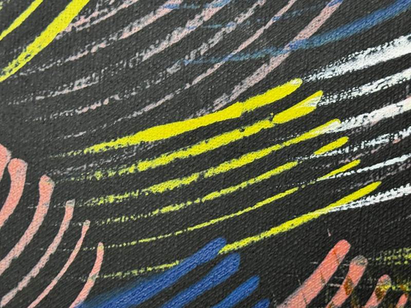 Executed in acrylic on Belgian linen, the painting becomes a living field of energy, translating ceremonial rhythm into modern abstraction. Layers of ochre, cadmium yellow, ultramarine blue, soft white, and charcoal grey create a luminous interplay of heat and shadow.