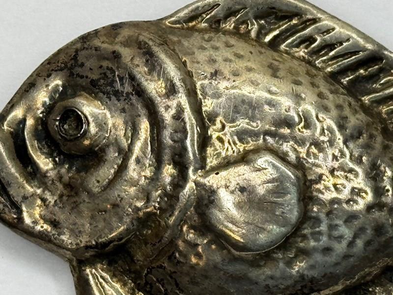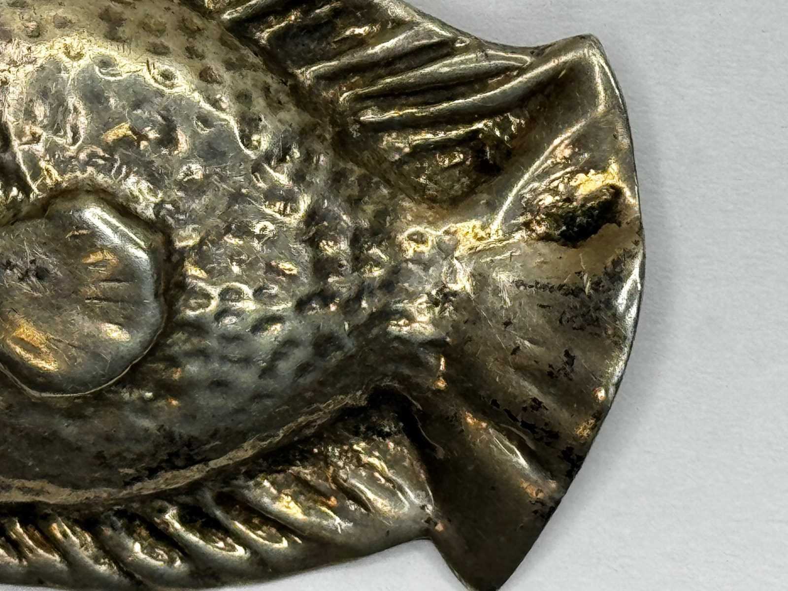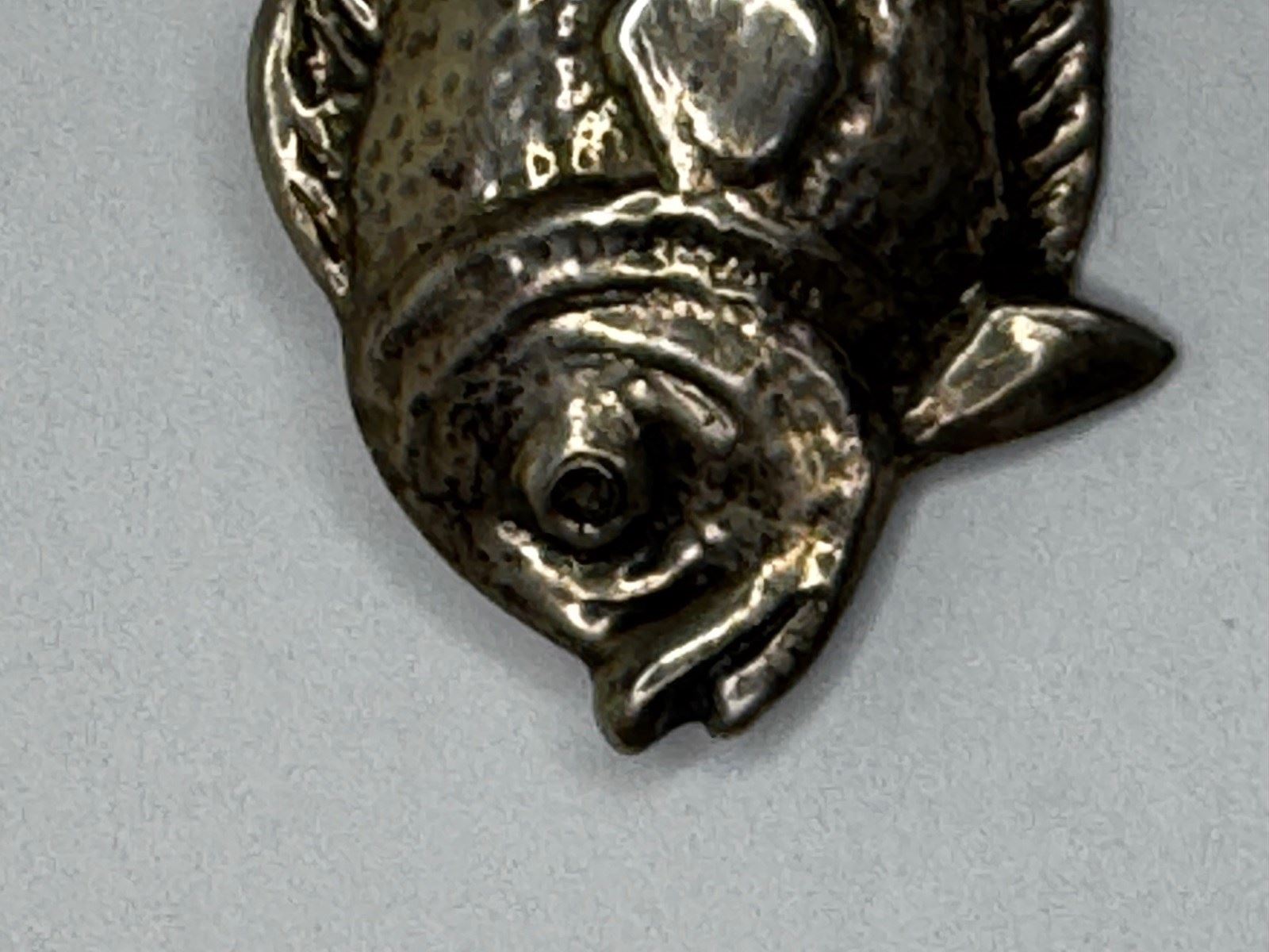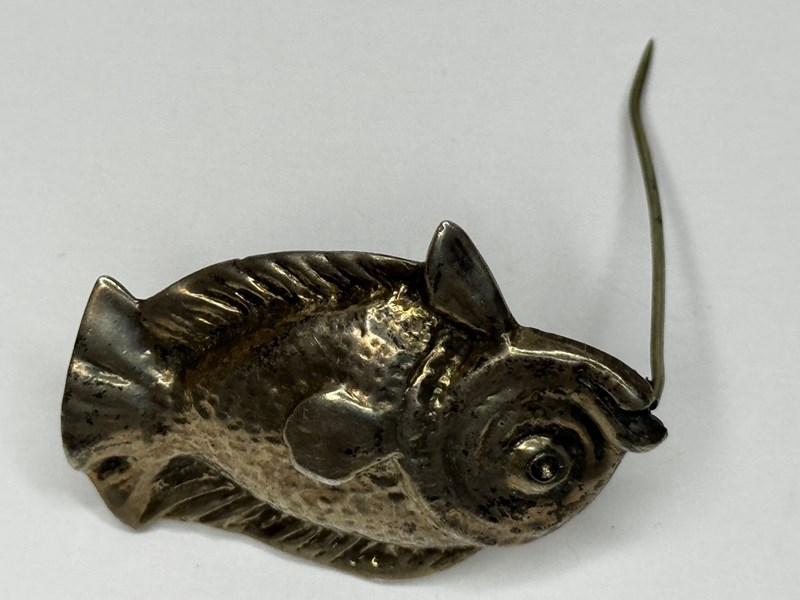 The bream profile is articulated through a softly modelled head and defined lips, a rounded body, and crisply simplified fins. What elevates the brooch—particularly for discerning American jewellery collectors—is the surface handling: a subtly planished/pebbled texture that creates shifting highlights across the body, contrasted by smoother, slightly raised areas that give structure and visual rhythm. In wear, it performs exceptionally well on darker textiles (cashmere, navy wool, black tailoring), where the texture catches light without appearing overly bright or “new.”