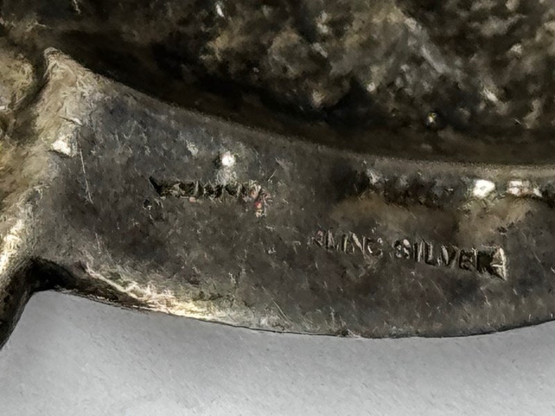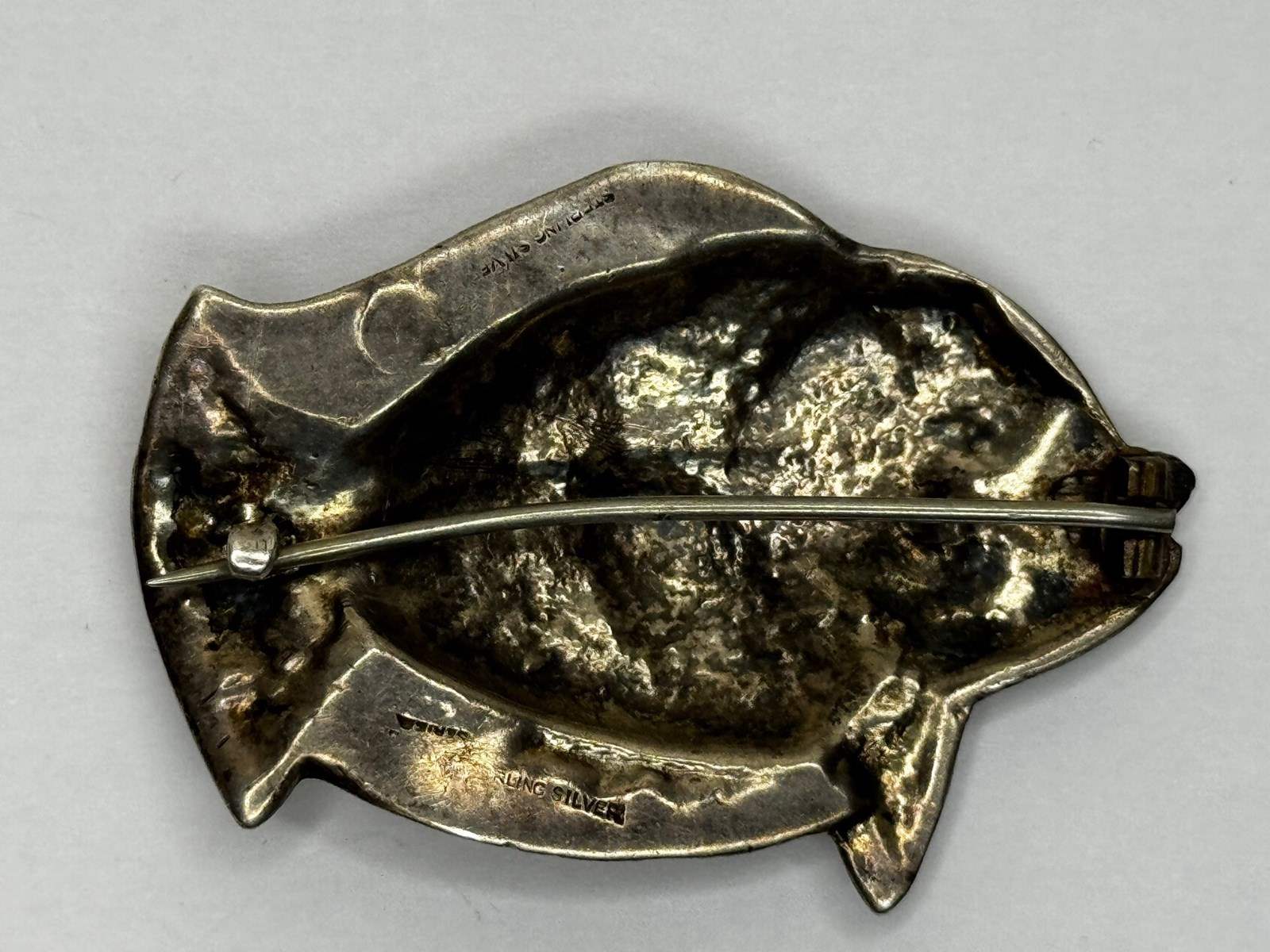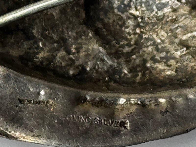Presented in good vintage condition, commensurate with age and prior wear. The silver shows light surface scuffs and fine scratches visible under close inspection, along with areas of natural tarnish/patina—particularly within recesses and around textured zones—which enhances contrast and definition. The purity mark is partially struck/partially worn, reading “STER / …LING SILVER,” consistent with age and handling. No obvious splits or repairs are apparent in the provided images. As with all vintage pins, the clasp/hinge should be checked prior to dispatch; if you provide a clear reverse photo of the findings, this section can be refined to describe the mechanism precisely.