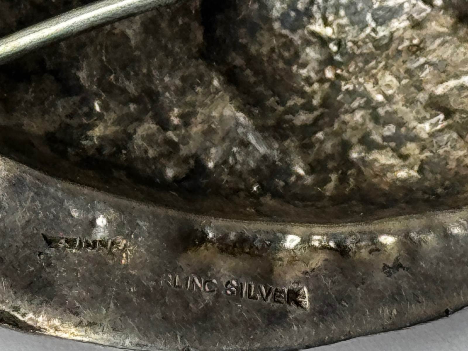 The reverse carries a split/partial purity stamp reading “STER / …LING SILVER,” consistent with the standard “STERLING SILVER” designation. There is an indistinct maker’s cartouche mark to the left, above the sterling hallmark area. The silver presents with an honest vintage patina that suits the modernist aesthetic and complements the texturing.