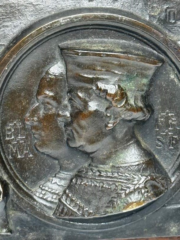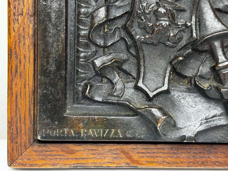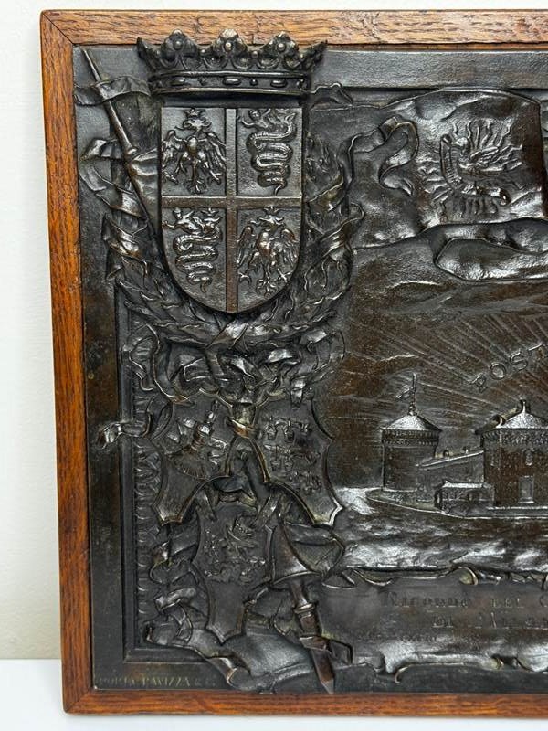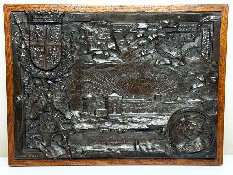 A distinguished late-19th-century Italian bronze plaque cast by the noted Milanese foundry Porta Ravizza & Co., produced during the celebrated restoration of Castello Sforzesco. Modelled in an impressive 4 cm high relief, the plaque combines architectural accuracy with a sophisticated Renaissance Revival heraldic programme.