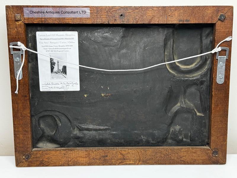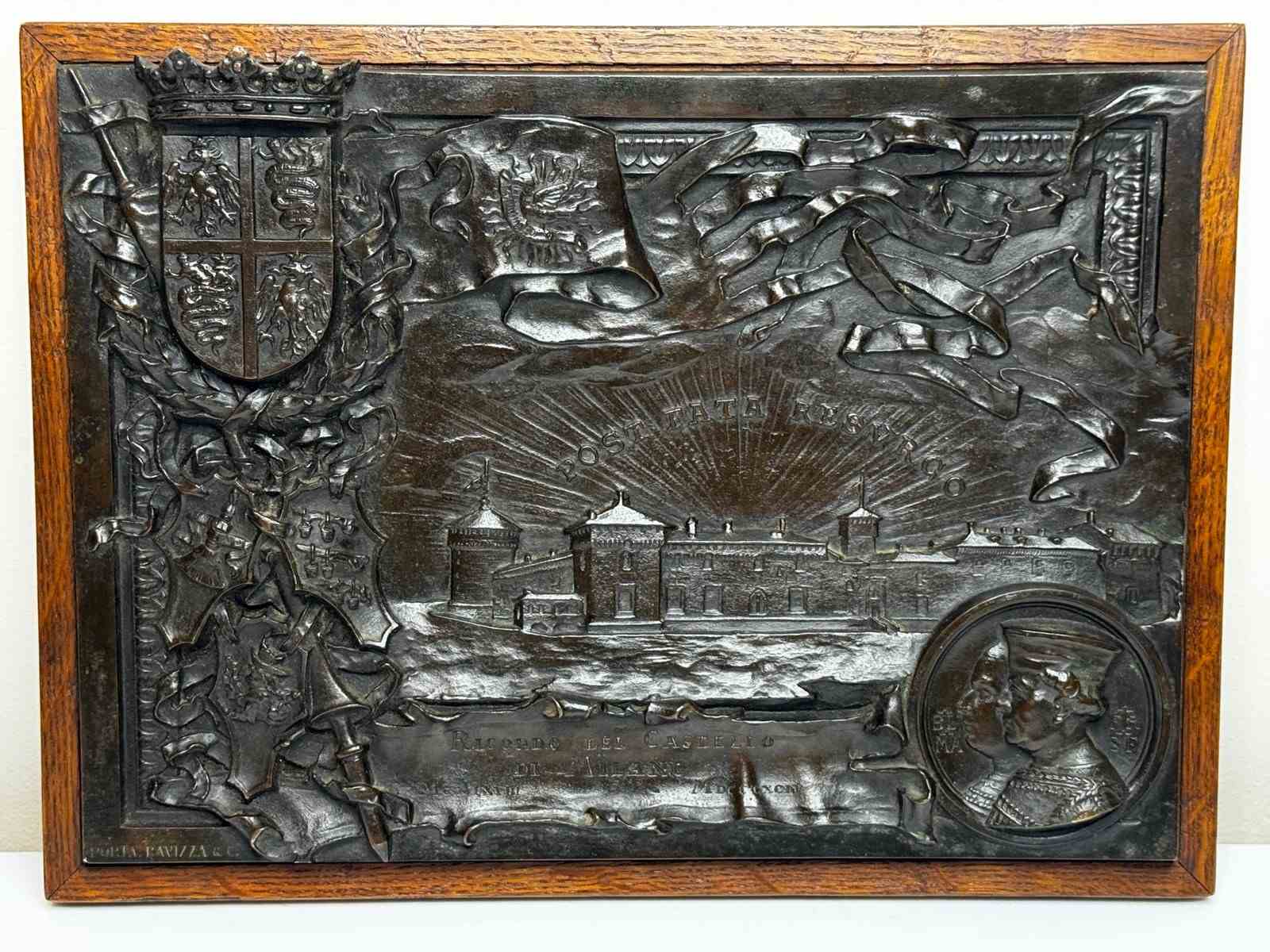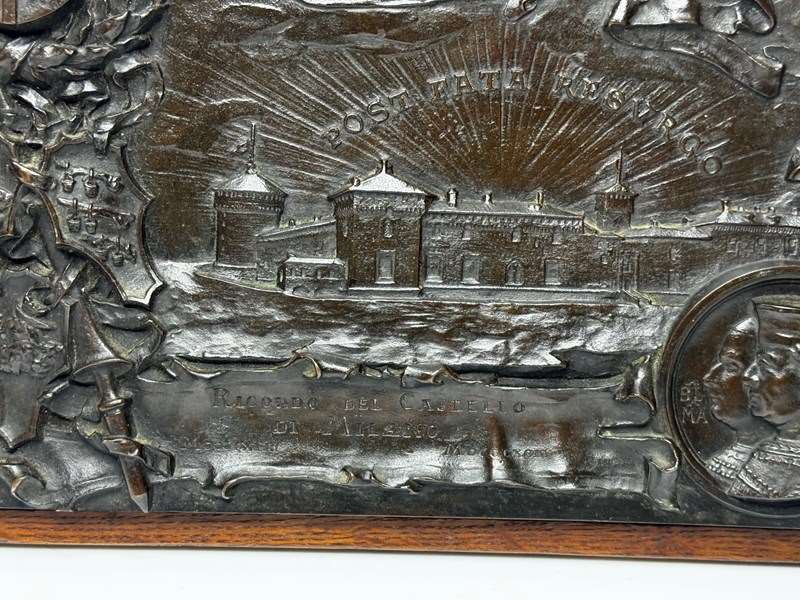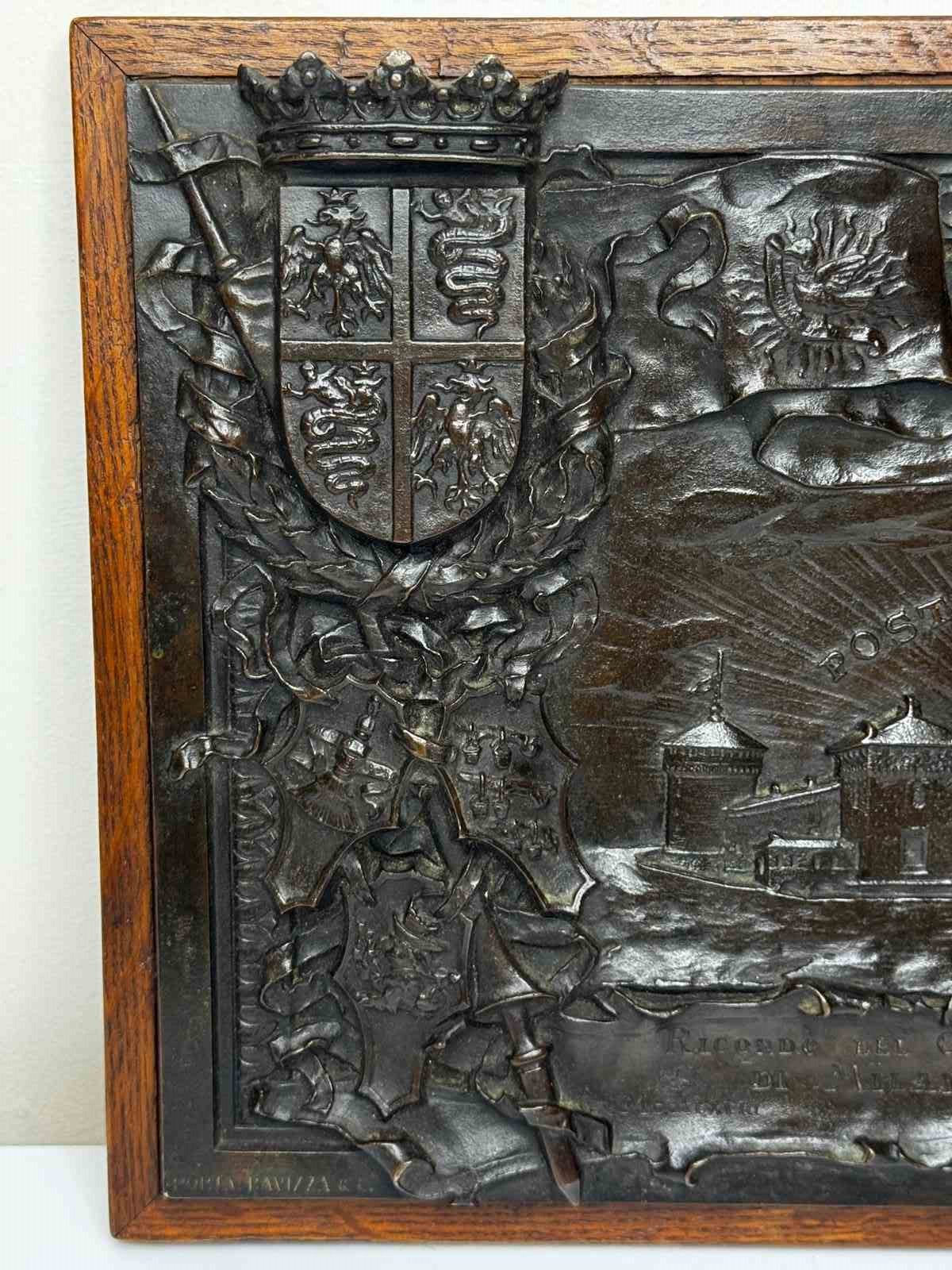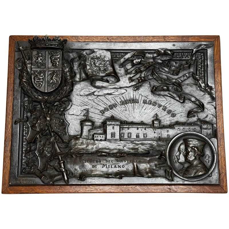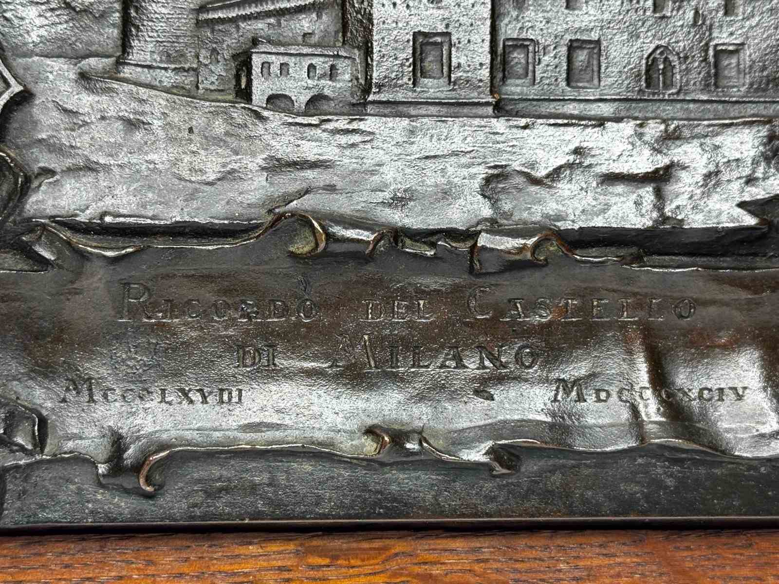 19th-Century Milanese Bronze Plaque by Porta Ravizza & Co., Depicting Castello Sforzesco with Sforza–Visconti Heraldry in Tiger Oak Frame