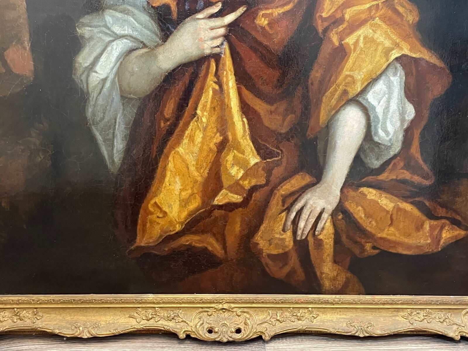 Presented in a richly ornamented gilt wood frame with scrolling foliate decoration. The gilded frame complements the golden tones of the costume and enhances the painting’s architectural presence.
