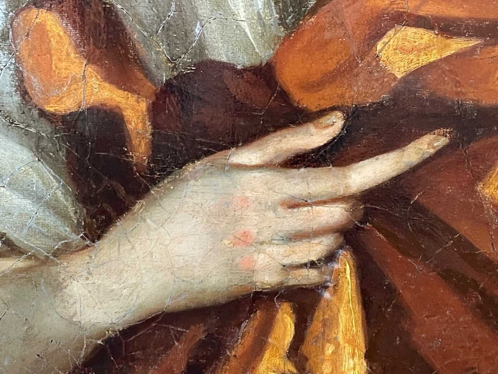 Her luminous golden silk gown is beautifully rendered in sweeping folds of amber and ochre tones, painted with layered glazing to convey depth and richness. The white lace cuffs and chemise sleeves offer crisp contrast against the warmth of the drapery.
