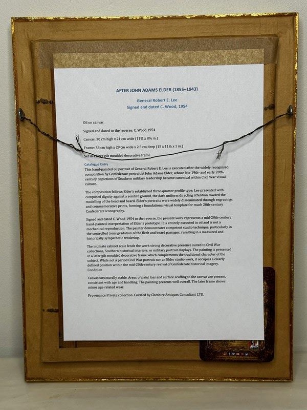 John Adams Elder’s portraits helped define the enduring visual archetype of Lee — dignified, composed and authoritative. Through engravings and printed reproductions, Elder’s composition became widely disseminated and served as the model for later painted interpretations, including this 1954 homage created during renewed mid-20th-century interest in Civil War imagery.