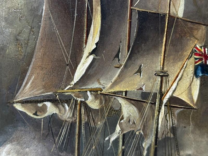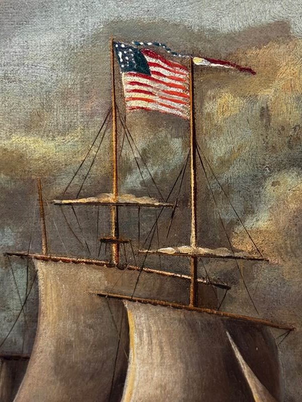 Overall in good antique condition consistent with age. The canvas has been relined; the paint surface is stable with expected historical craquelure and patina. Minor historical overpainting is present to part of a sail and a small area of the lower sea; these restorations are limited and do not materially detract from overall presentation or impact. The gilt frame shows handling wear consistent with age. Photographs form part of the description; close inspection is recommended.