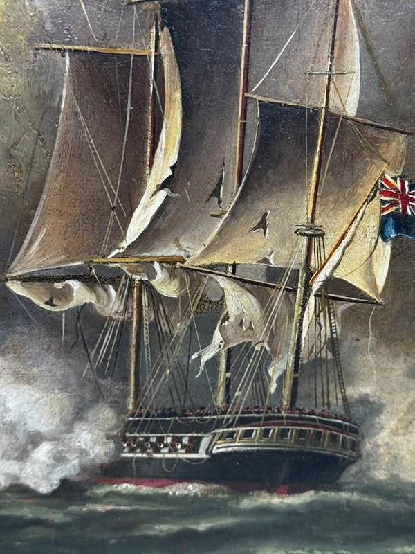 Offered in the manner of Thomas Buttersworth (1768–1842), a prominent British marine painter known for ship portraiture and naval battle pictures. Characteristic features associated with Buttersworth and his circle—legible silhouettes, an active heaving sea, structured sky planes and the staging of engagements for instant readability—are evident in this work. Paintings in this manner were produced for collectors seeking drama, authority and romance in maritime subjects.