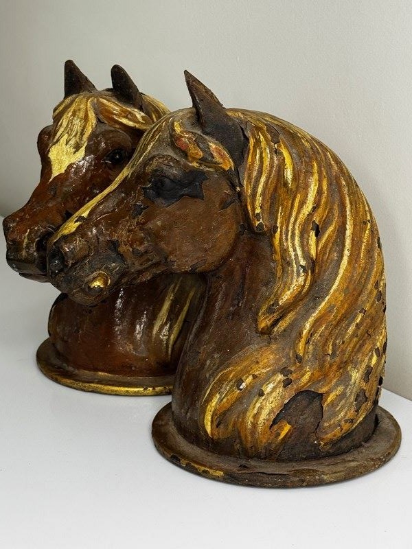 This rare pair of late Victorian architectural horse-head gatepost finials captures the 19th-century fascination with equestrian imagery as a symbol of nobility, guardianship, and strength. Cast in iron and retaining traces of their original black painted surface, these finials served not only as functional cappings for grand estate entrances but also as statements of refinement and social standing.
