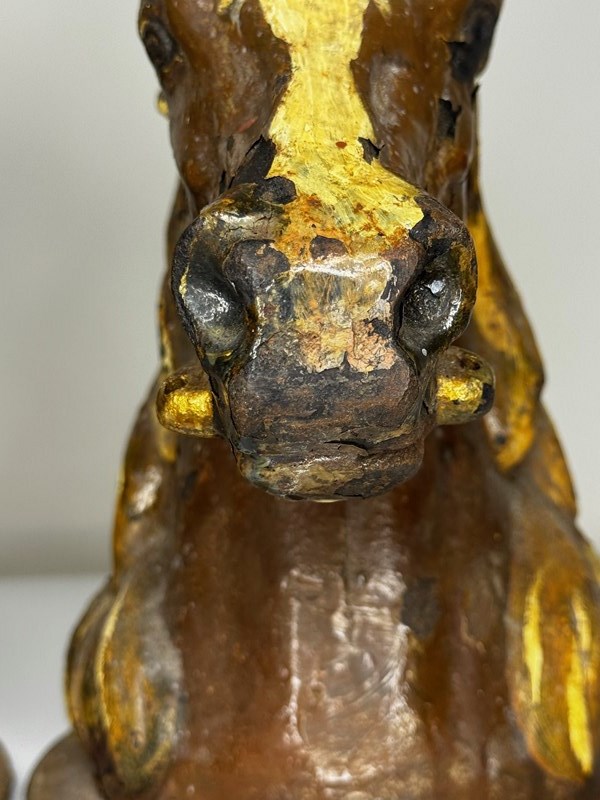 Their surviving painted finish, surface wear, and patination add to both their authenticity and visual depth. Cast with proud bearing, arched necks, and alert ears, these works represent not an individual horse, but the idealised equestrian form celebrated in 19th-century art and design. Their robust physiques and noble expressions evoke the classic bay stallion—favoured for its associations with speed, reliability, and strength—while the black painted finish was intended to complement architectural ironwork rather than reflect natural colouring.