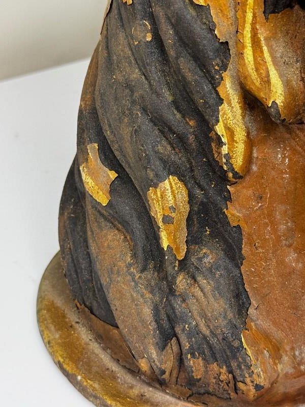 Presented in fine antique condition consistent with outdoor use and age. Both finials display paint chips, scuffs, scratches, rust, and areas of flaking paint with underlying oxidation. They have been overpainted; light sanding and repainting is recommended if restoration is desired. These qualities are commensurate with their history and add to their authenticity and character.