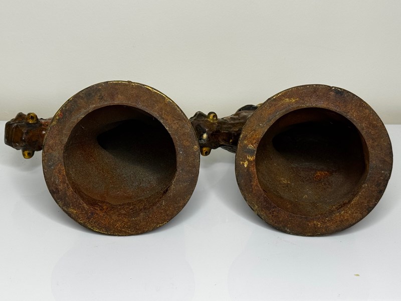 The pair is attributed to the Glasgow School–influenced designs of Walter Macfarlane & Co.’s Saracen Foundry in Glasgow. Renowned worldwide, Macfarlane’s ornamental ironwork adorned civic, domestic, and garden settings across Britain and the United States during the late 19th century, making their creations highly sought after today.