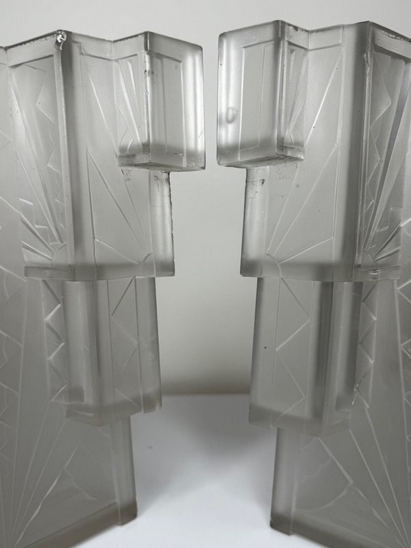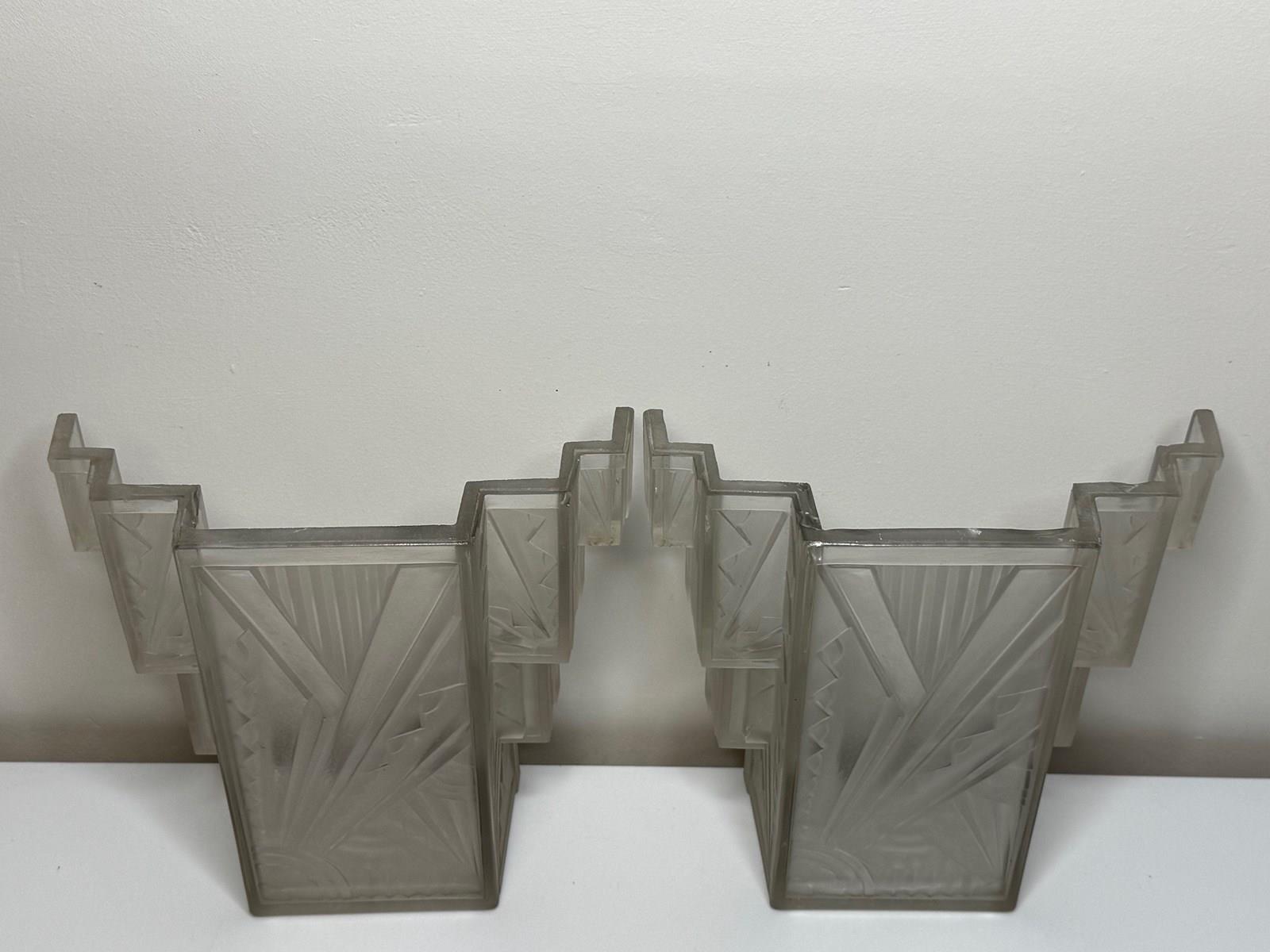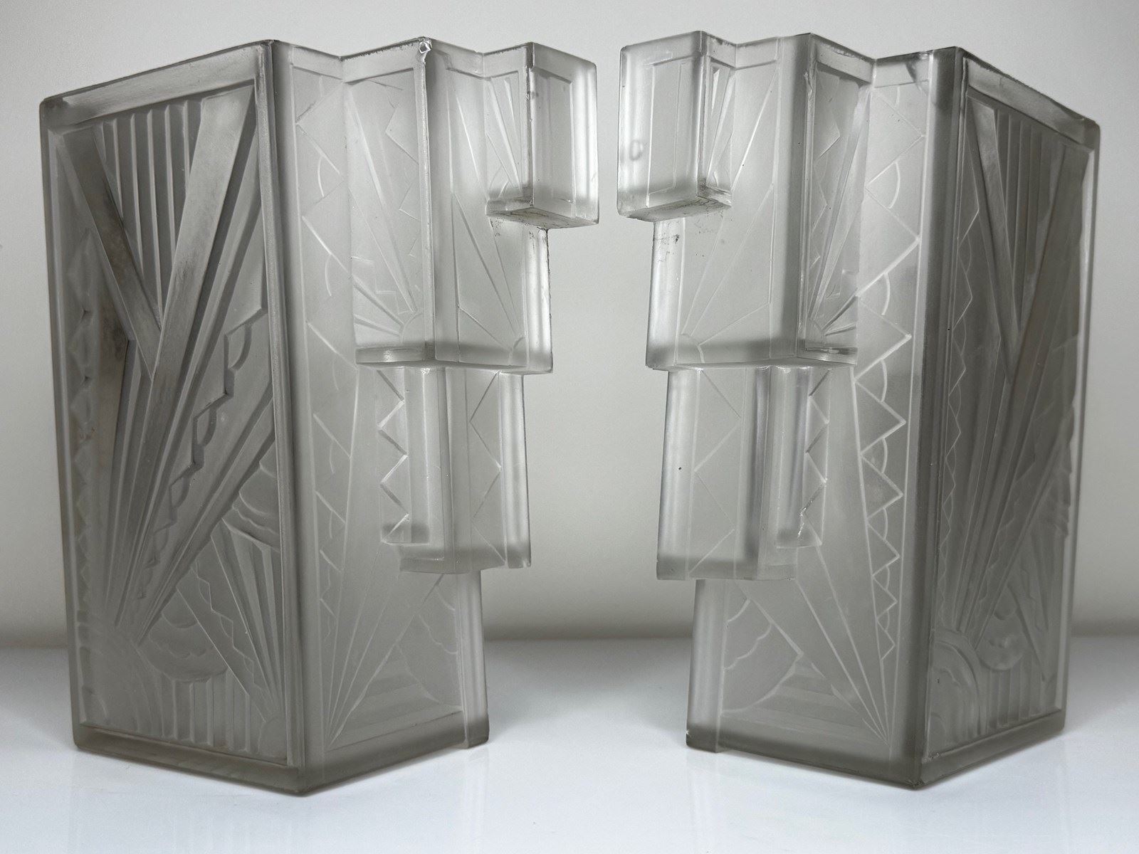 Pair of French Art Deco Moulded & Frosted “Skyscraper” Glass Wall Appliqués