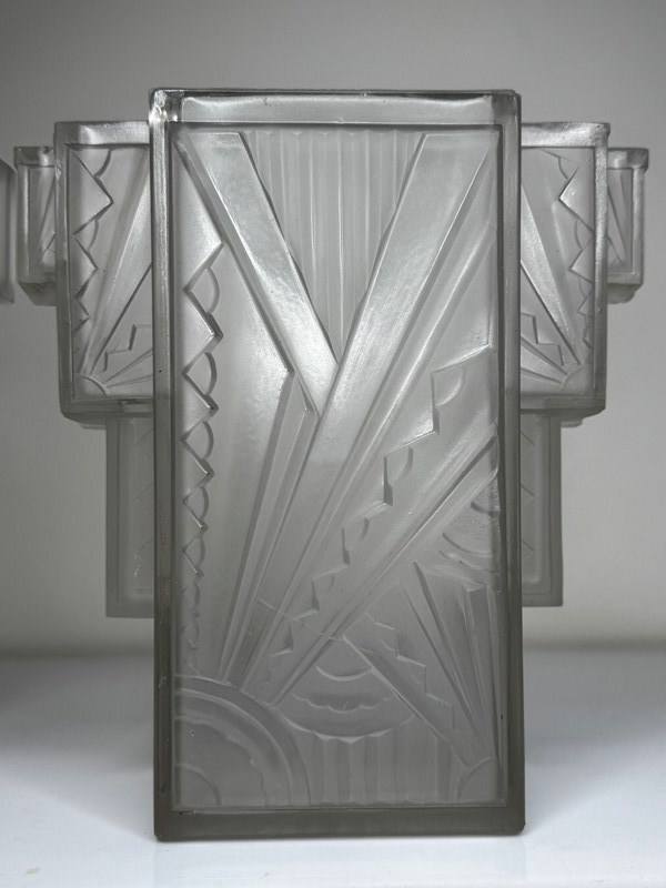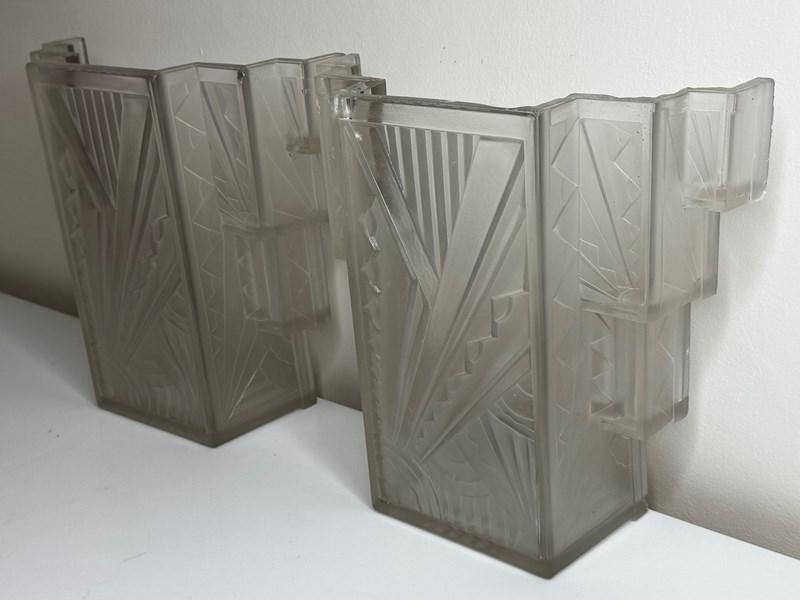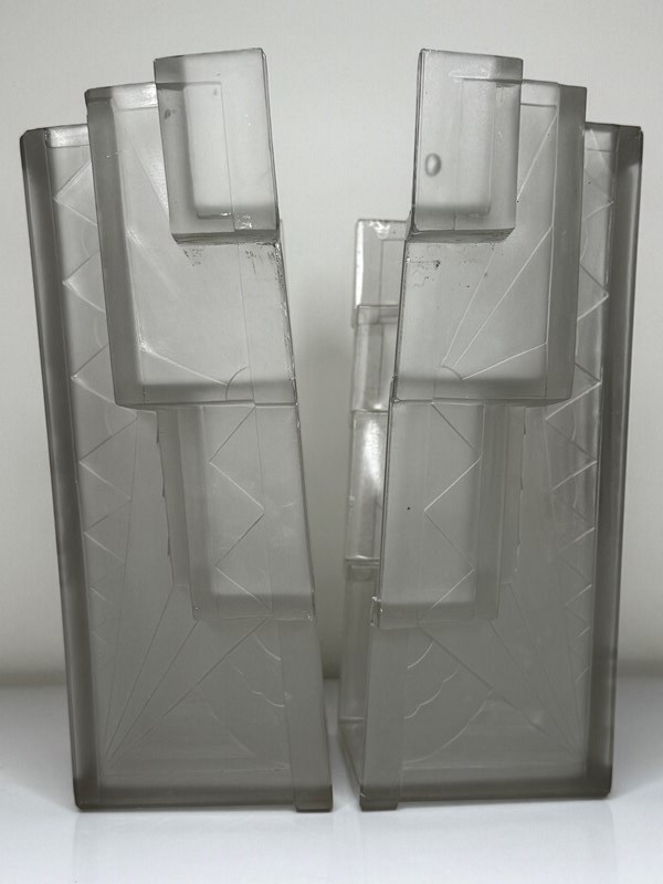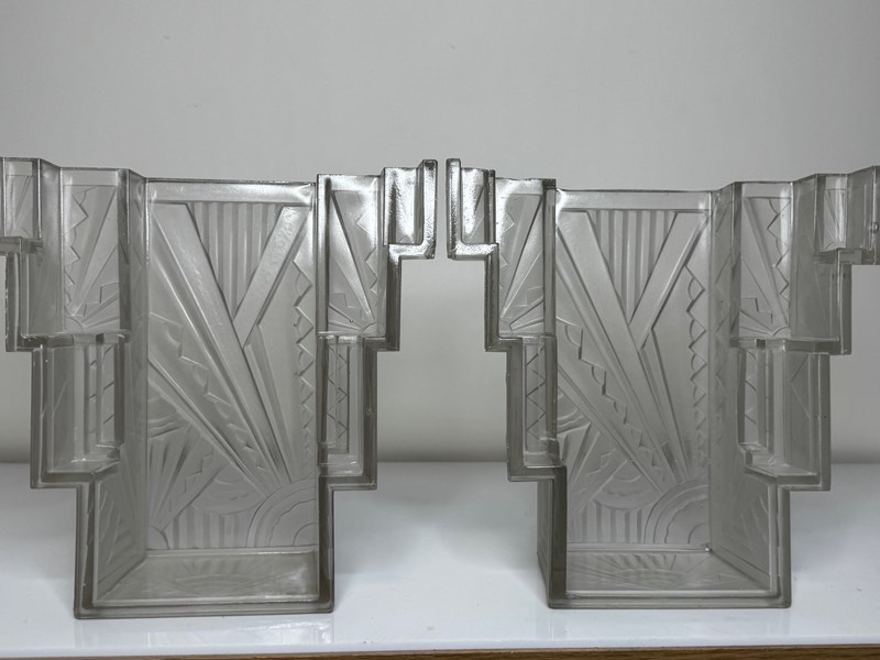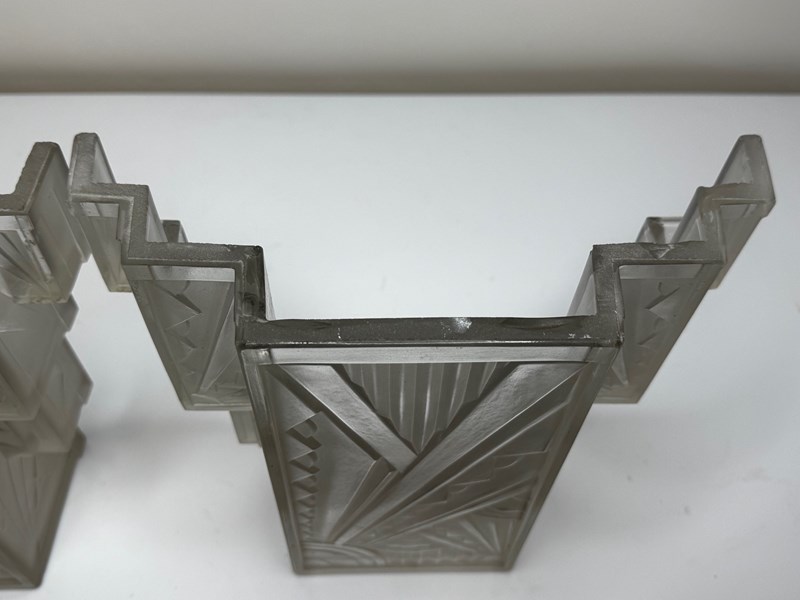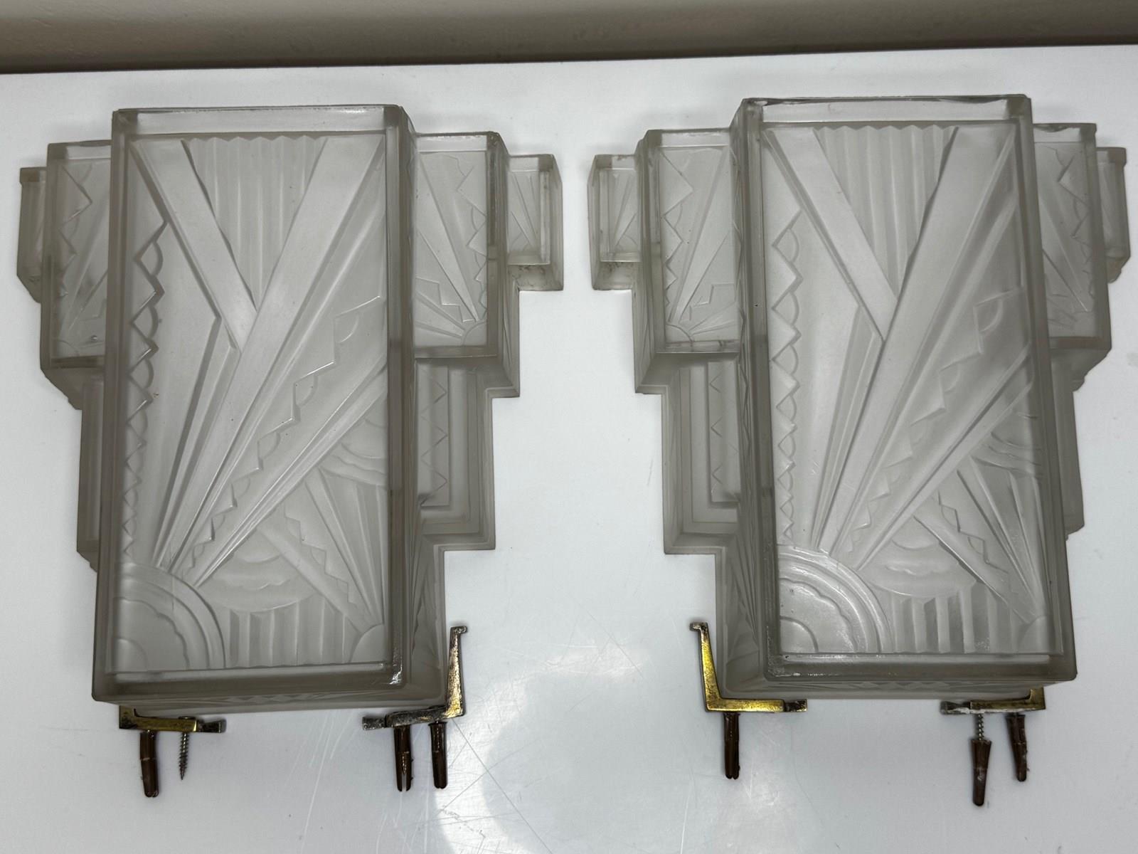 Pair of French Art Deco Moulded & Frosted “Skyscraper” Glass Wall Appliqués