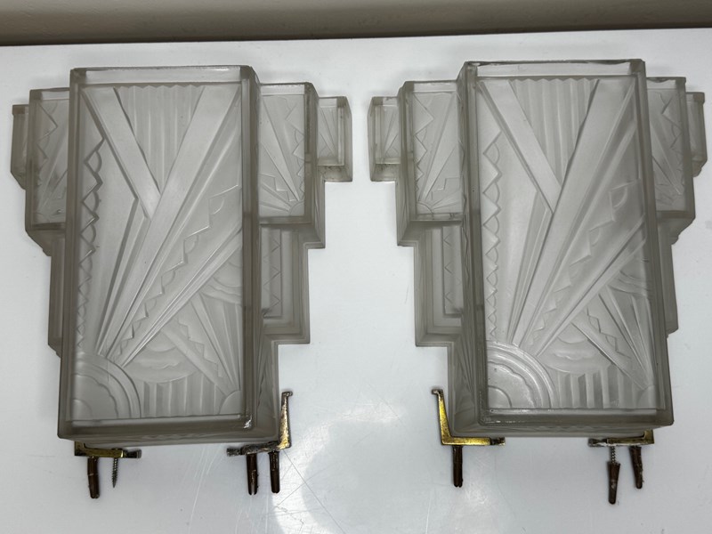 The shades retain their four original brass support fixings – simple period bent brass wall brackets – which hold each piece slightly off the wall so they read as small illuminated architectural panels rather than conventional sconces. The powerful geometry, stepped “skyscraper” outline and dynamic rays are very much in the manner of Marius-Ernest Sabino’s moulded-glass lighting, and closely comparable in idiom to designs by Établissements Jean Gauthier (EJG / Ezan) and Verreries des Hanots. Unsigned, however, the quality, weight and design vocabulary are entirely consistent with French Art Deco glass of the interwar years.