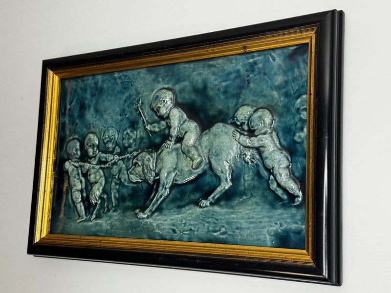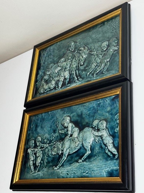 This pair of ceramic relief plaques, depicting playful putti/cherubs with animals, remains in good antique condition. They retain their original glaze and are well-presented in matching later black and gilt frames which have some losses and overpainting touch ups in places. The artworks show expected age-related wear.