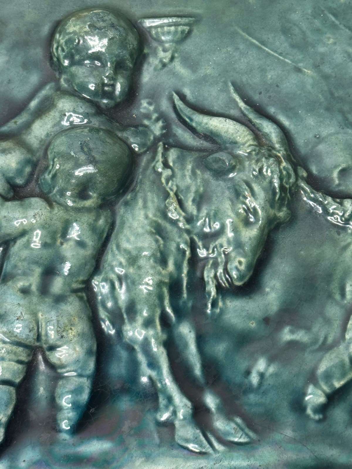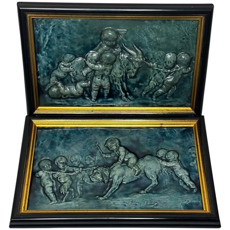 Pair Arts & Crafts Turquoise Glazed Ceramic Relief Tile Plaques c.1909 🐐🐕 Children & Satyr With Dog & Children With Goat Reginald Robert Tomlinson (1885–1978), After Claude Michel (Clodion)