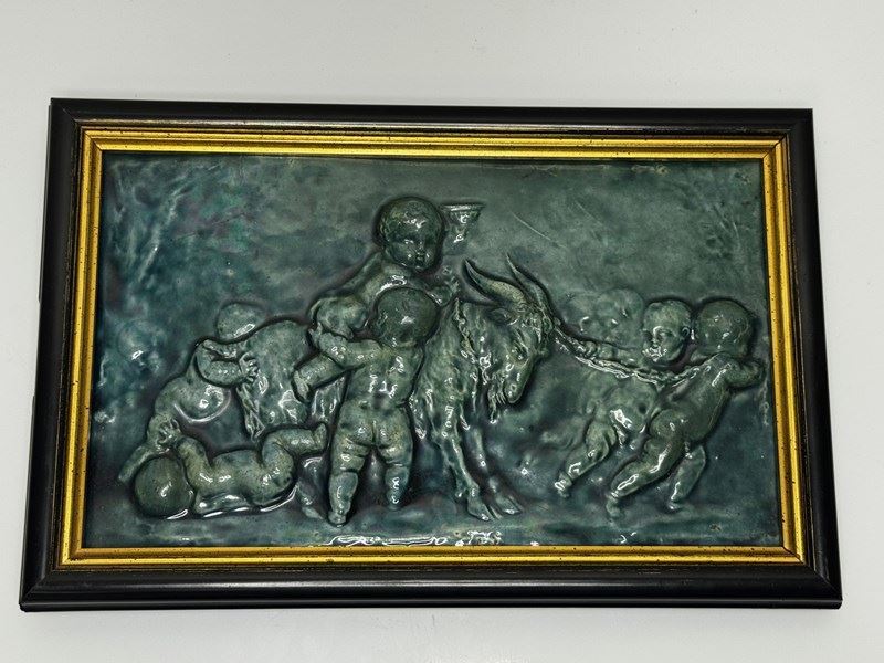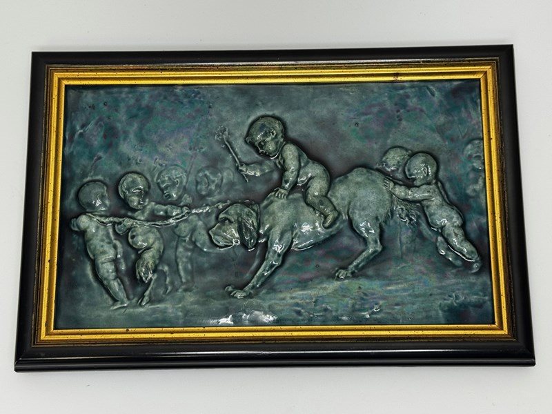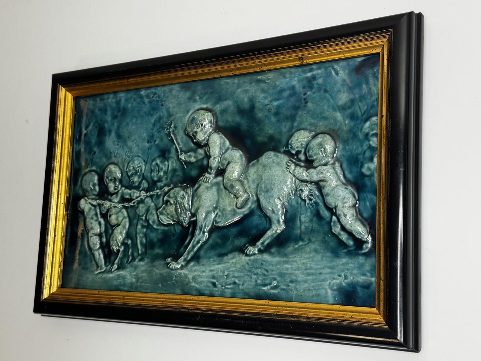 A rare pair of Arts & Crafts era turquise glazed ceramic relief tile plaques, c.1909, richly finished in mottled teal-blue tones and mounted in original gilt-lined ebonized frames. Subjects: Enfants au Chien (Children with Satyr & Dog) and Enfants à la Chèvre (Children with Goat) 🐐. Both compositions are inspired by Rococo reliefs by Claude Michel, known as Clodion (1738–1814), famed for his playful depictions of putti and Bacchic revelry.