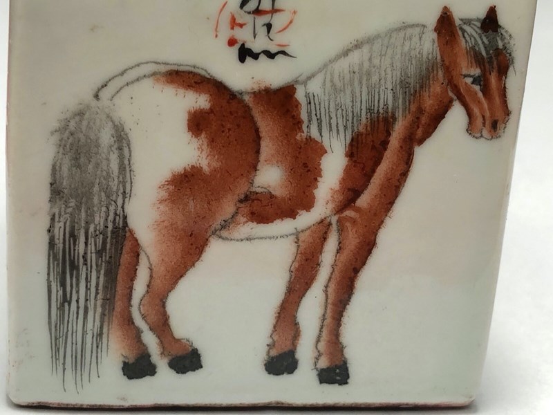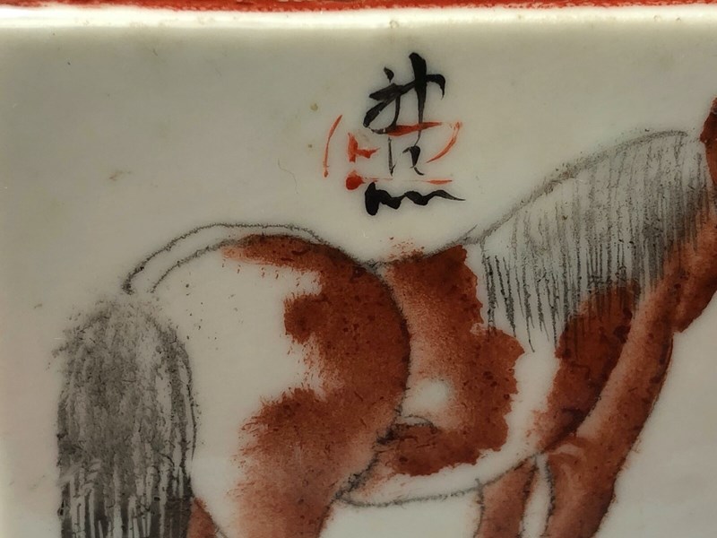 Of square form, each side decorated with spirited horses rendered in iron-red tones with subtle grey shading. The painting is confident and expressive, with careful attention to musculature and movement.