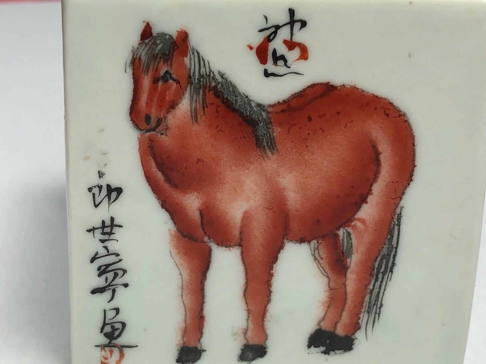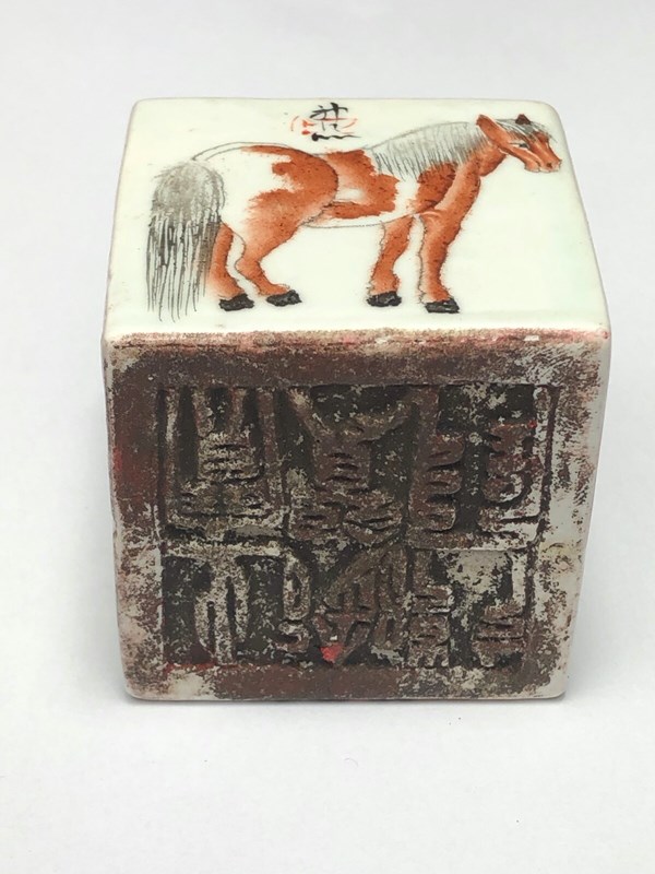Late Qing Chinese Porcelain Scholar’s Cube Seal Block with Horses
