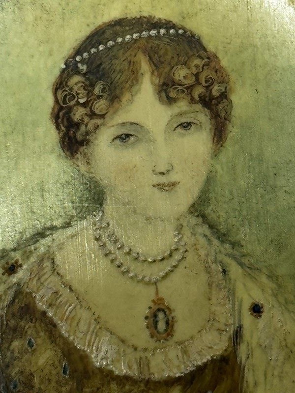 Executed in watercolour with gouache highlights on panel, the portrait balances subtle modelling with luminous finish: porcelain-like flesh tones, sharp detailing of jewels and fabrics, and a serene atmosphere characteristic of the Edinburgh school.