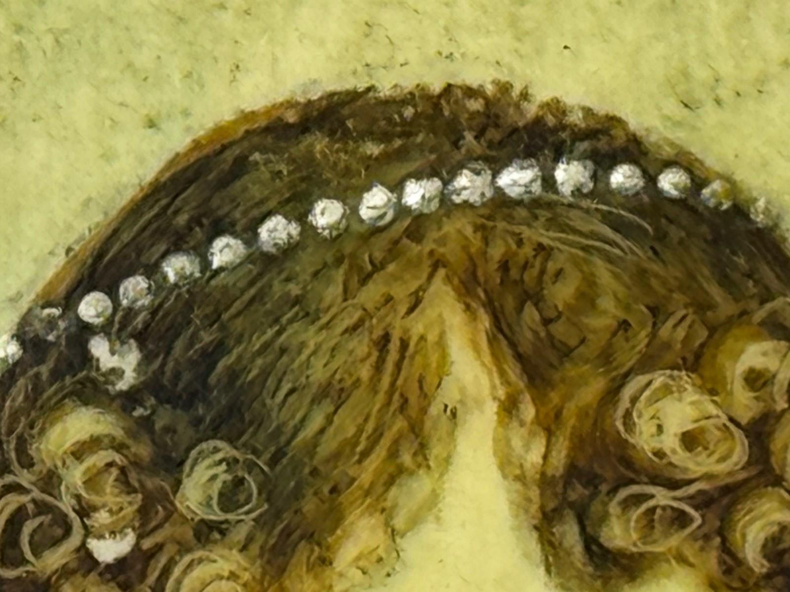 Jewellery: Pearls heightened with bodycolour; gold clasp finely suggested.