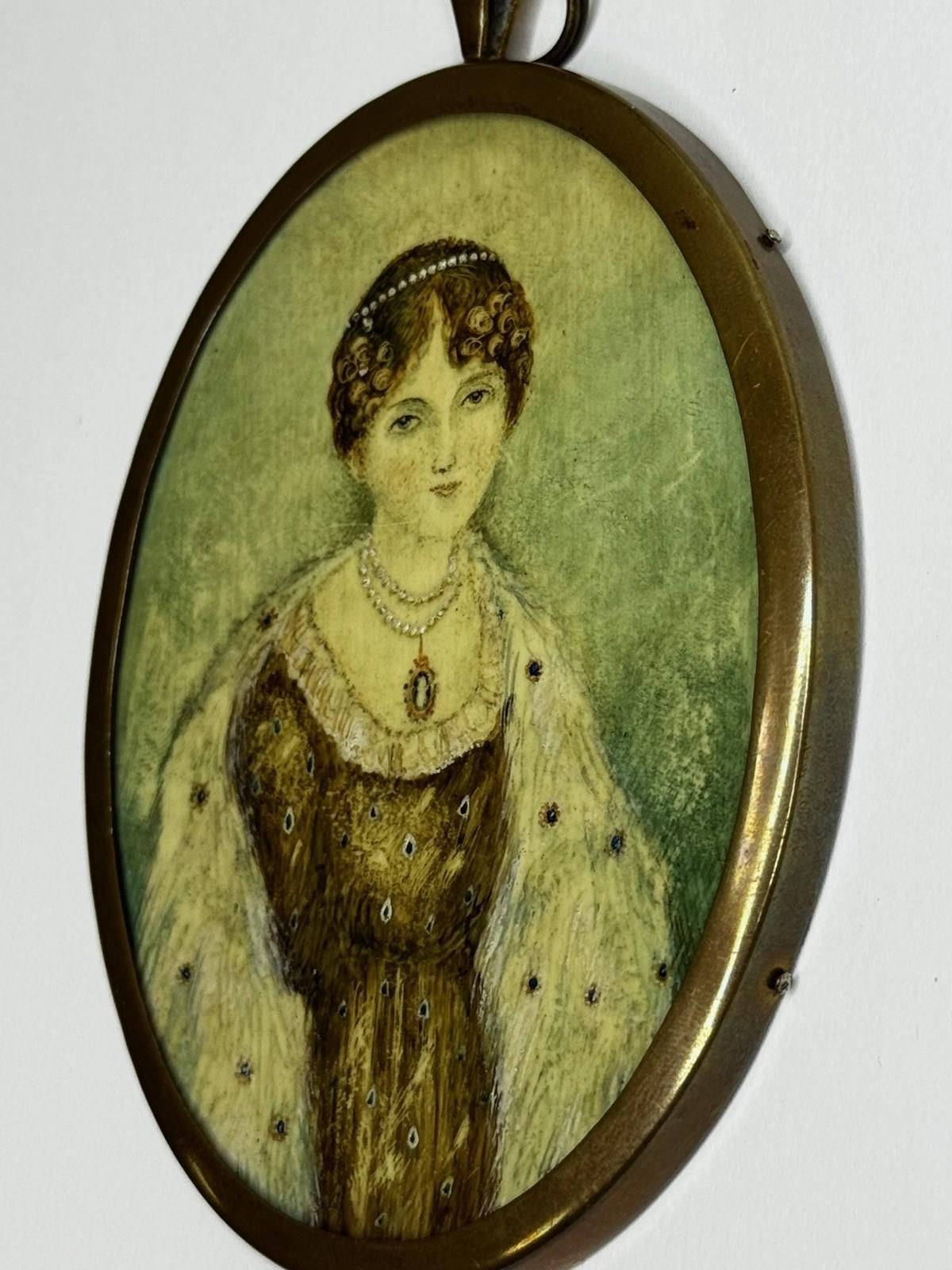 This finely executed portrait miniature depicts Lady Scott (Alicia Anne Spottiswoode, 1810–1900), later the wife of Sir William Scott of Ancrum, 6th Baronet. Painted around 1827, when she was about 17 years old, Alicia Anne is shown wearing a gown of soft cream and pale rose, trimmed with delicate ruffles and draped in an ermine-trimmed cloak. Pearls adorn her hair, encircle her neck, and rest as a pendant on her breast — unmistakable signs of her aristocratic status.