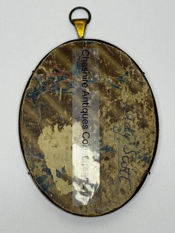 Unsigned, as was common for miniatures of this type. The sitter’s identity is secured by a period inscription on the reverse: “Lady Scott.”