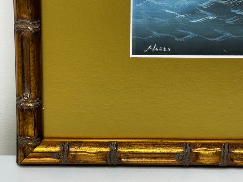 For a painting executed in 1914, the condition is good. The gouache surface is stable and well preserved, with strong, clear colour and no disfiguring losses, with some foxing visible on close inspection. The gold mount shows gentle, even toning, entirely consistent with age and adding to its period charm. The faux-bamboo gilt-wood frame is structurally sound, with an attractive, honest patina. Recent AR70 museum-grade glazing provides excellent clarity and effective UV protection. Overall, this is a clean, well-preserved, historically intact example, ready to hang.