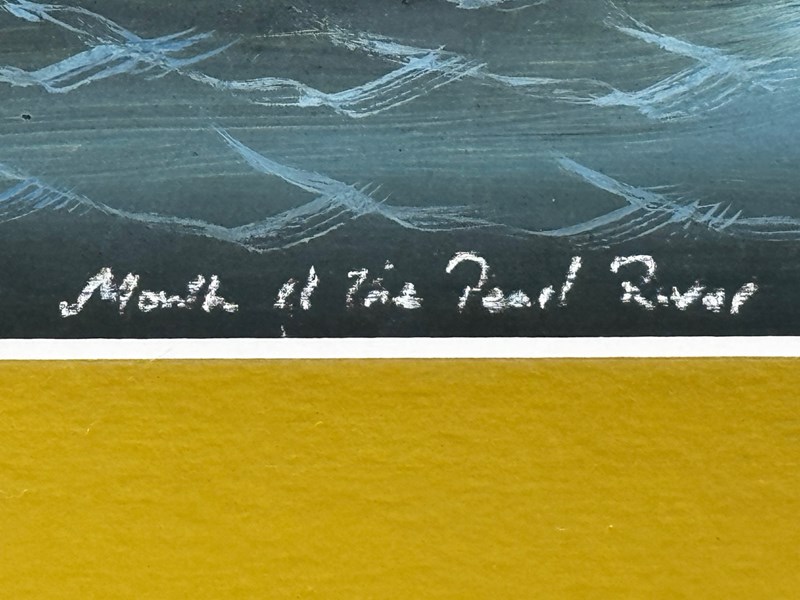 A signed, titled and precisely located Hong Kong School gouache, depicting the mouth of the Pearl River in 1914 at the very end of the age of sail in South China.