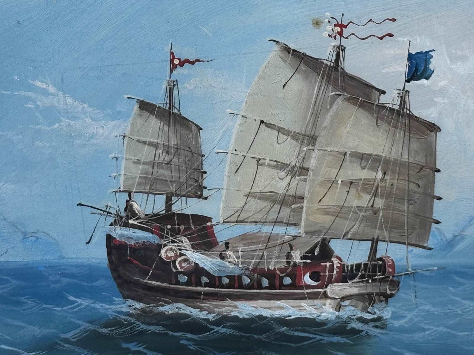 The junk’s red-painted hull – a colour associated both with anti-fouling treatments and good fortune – stands out vividly against the green-grey water. Rows of ports and hatches, the sweep of the steering gear and the bustle of crew on deck are rendered with meticulous care, presenting the vessel not as a generic “Chinese boat” but as a specific, working trading ship.