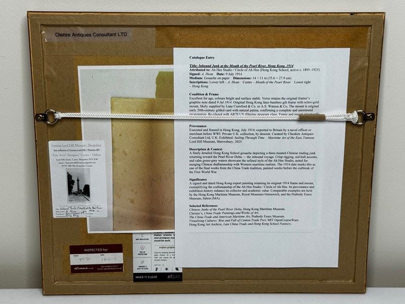 Painted and inscribed in Hong Kong in July 1914 by a member of the Ah Hee Studio, the work was framed there on 9 July 1914, as confirmed by the framer’s inscription on the original backing card. It was almost certainly acquired by a British expatriate or naval officer and taken back to the United Kingdom shortly before the outbreak of the First World War, remaining thereafter in a private U.K. collection by family descent.