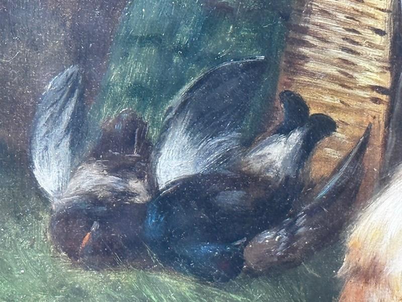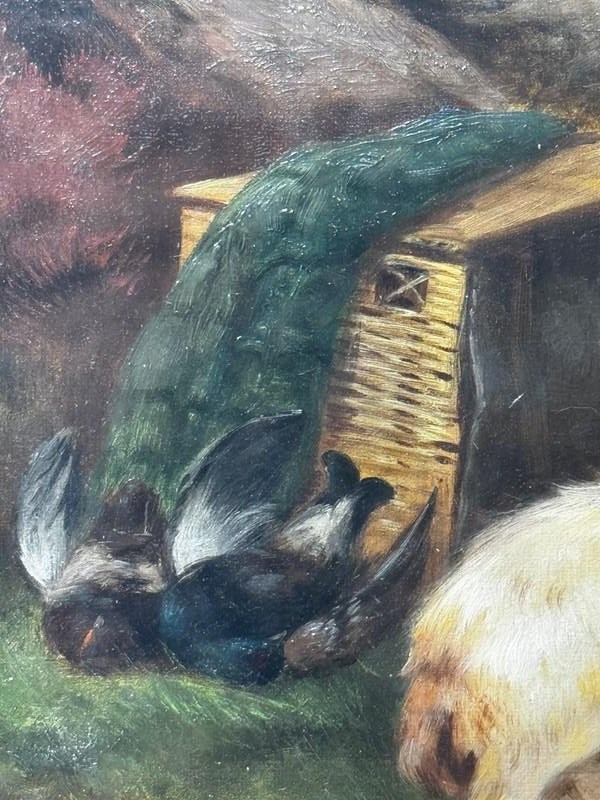 Light in the painting is gentle and diffused, with subtle highlights on the dogs and the basket suggesting late afternoon or early evening. It is not the harsh, high-contrast light of midday, but the softer glow that collectors often associate with the best Victorian sporting pictures. Overall, the composition is balanced and assured, and the attention to detail marks this out as one of Cleminson’s more considered works.
