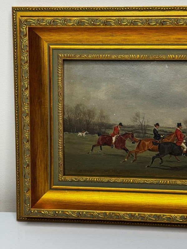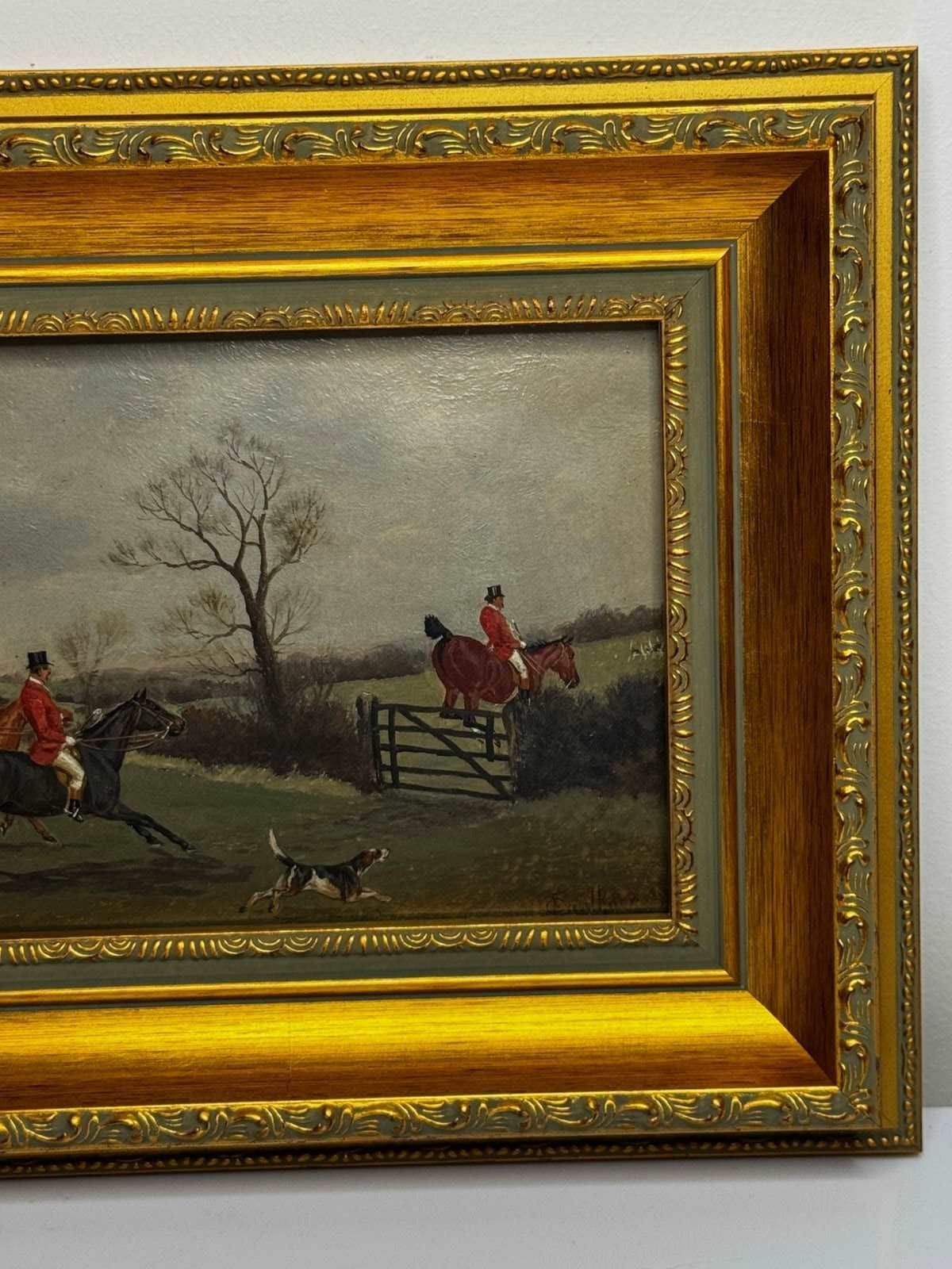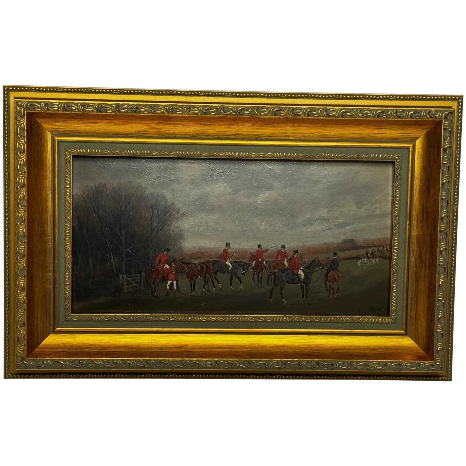 Executed in oil on board, this work depicts The Meet—the formal gathering of huntsmen and hounds at the start of the day’s chase. Set in Berkeley Vale, Gloucestershire, long associated with the historic Berkeley Hunt, the composition reflects the calm discipline, etiquette, and anticipation that precede the excitement of the hunt.