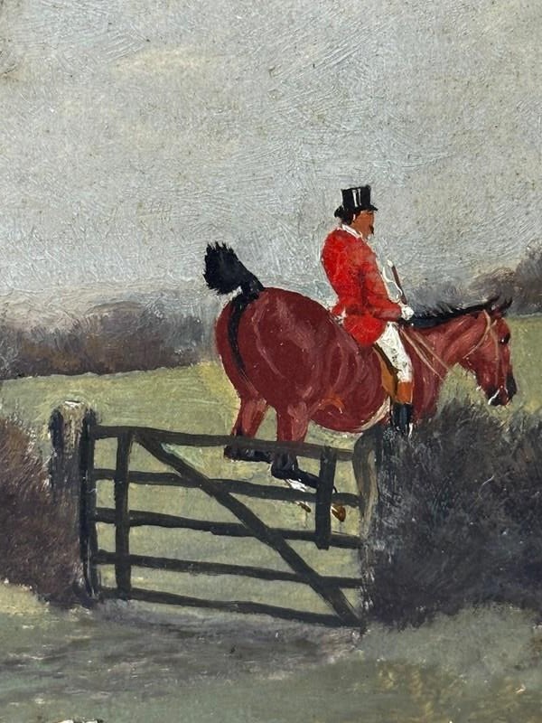 On the right, a huntsman and horse leap over a wooden gate, captured mid-air with palpable tension and energy—an iconic feature of Victorian hunting imagery.
