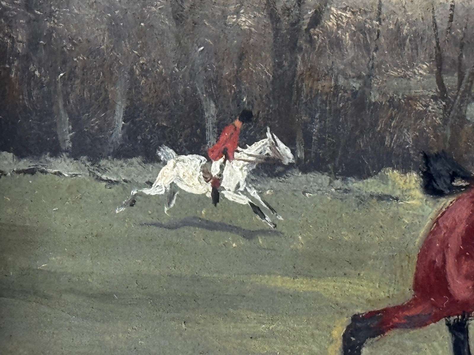 A leading hound races forward in full stride, establishing the painting’s pace.