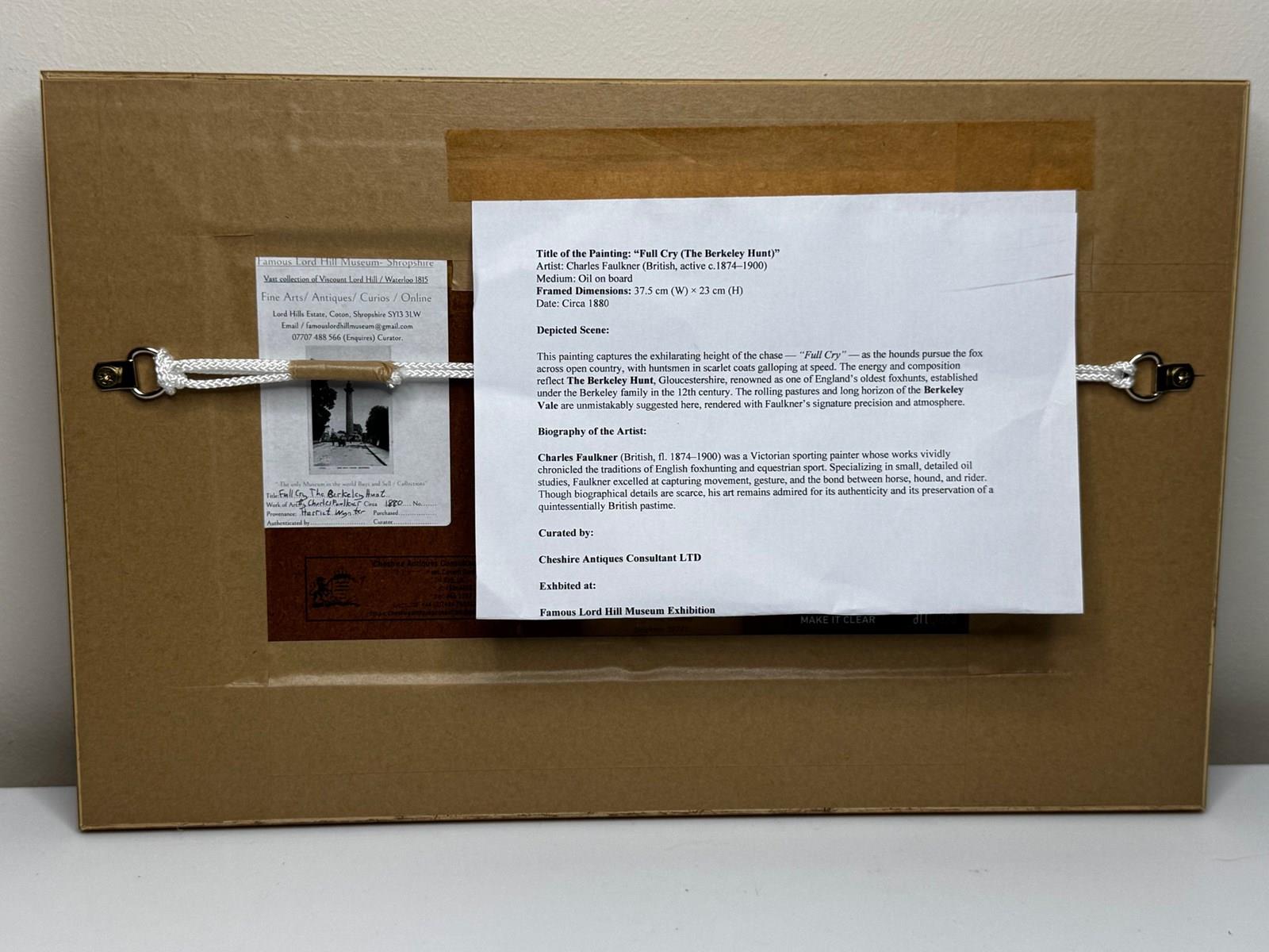 “Full Cry (The Berkeley Hunt)” is a finely detailed oil on board capturing the most exhilarating moment of a traditional English foxhunt. Faulkner’s medium-sized hunting scenes are admired for their clarity, precision, and lively character. Oil on board allows him to achieve tight, controlled detailing across figures and animals, while still conveying a broad atmospheric landscape. The result blends documentary accuracy with the romanticism typical of late Victorian sporting art.